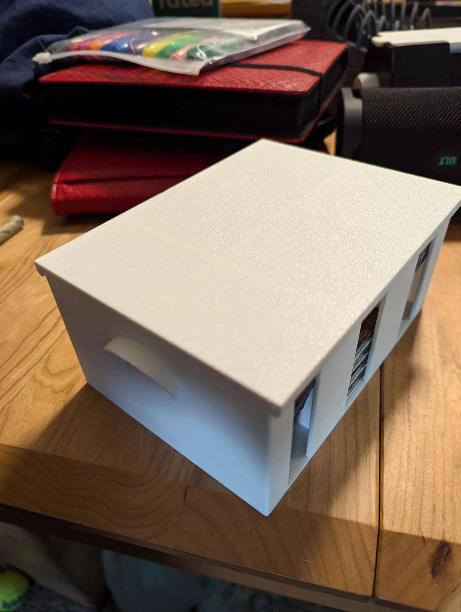 Mọi thứ được thiết kế và thử nghiệm để in bằng PLA hoặc PLA+ mà không cần support. Khe hở hơi sát nên để ngon nhất thì mình khuyên bạn nên in bằng nozzle 0.4 hoặc 0.6mm. Cái lớn hơn thì có xài được, nhưng nếu bạn không tự tin về máy in của mình thì có khả năng cao là thành hộp sẽ dày làm ô khó trượt vào ra hoặc nắp bị kẹt. Nên nếu bạn muốn thử cách đó hoặc dùng vật liệu khác có thể bị co ngót nhiều hơn, thì nhớ chỉnh scale cho phù hợp nhé.