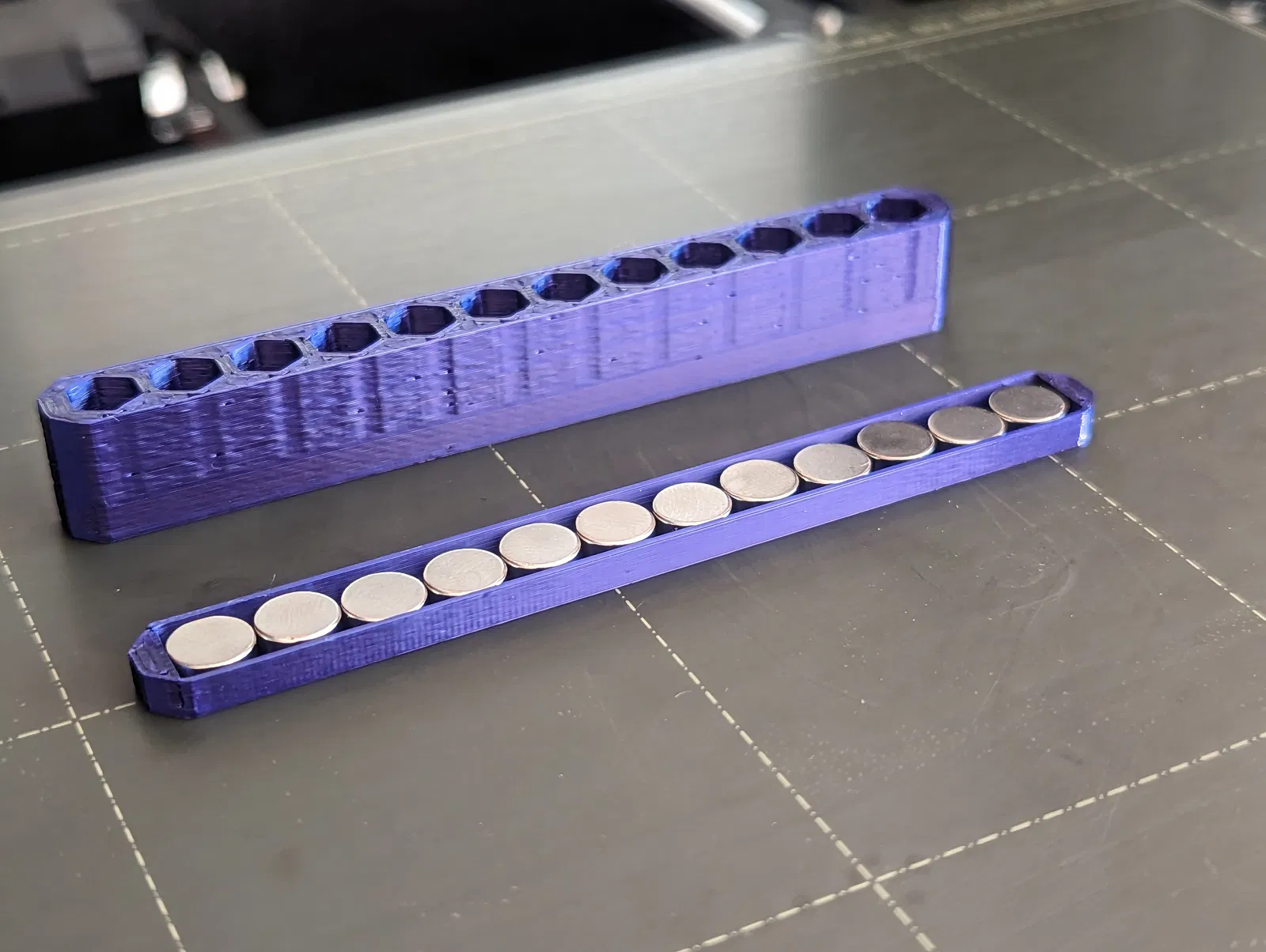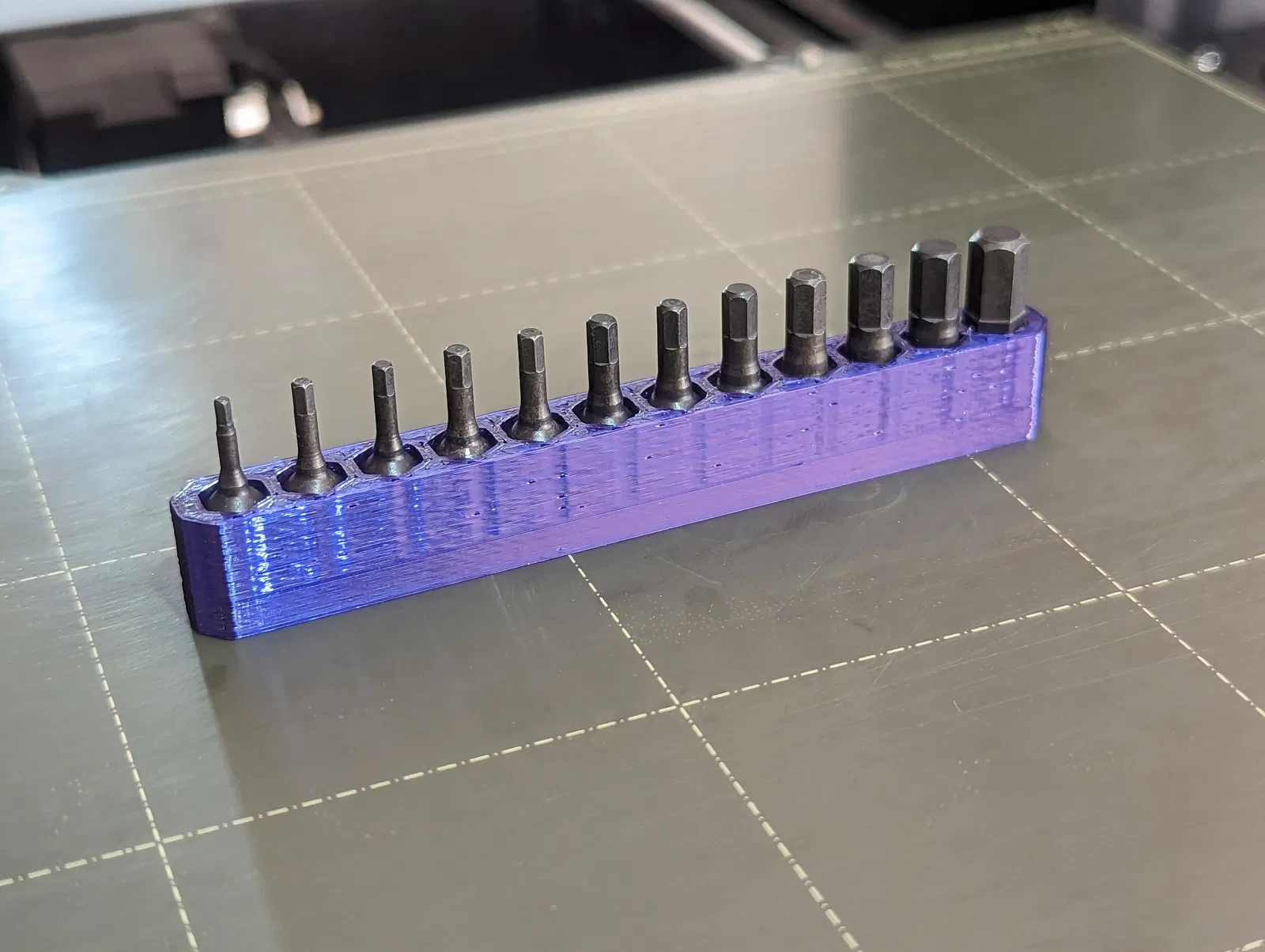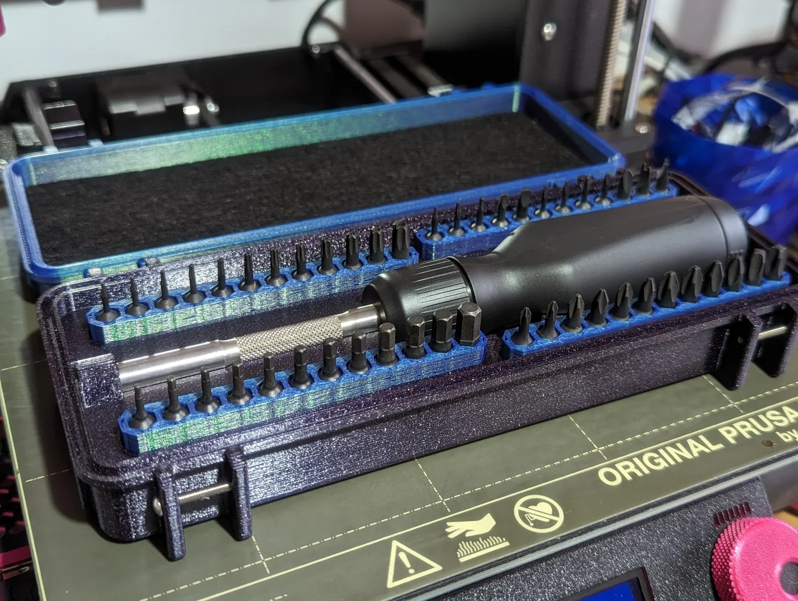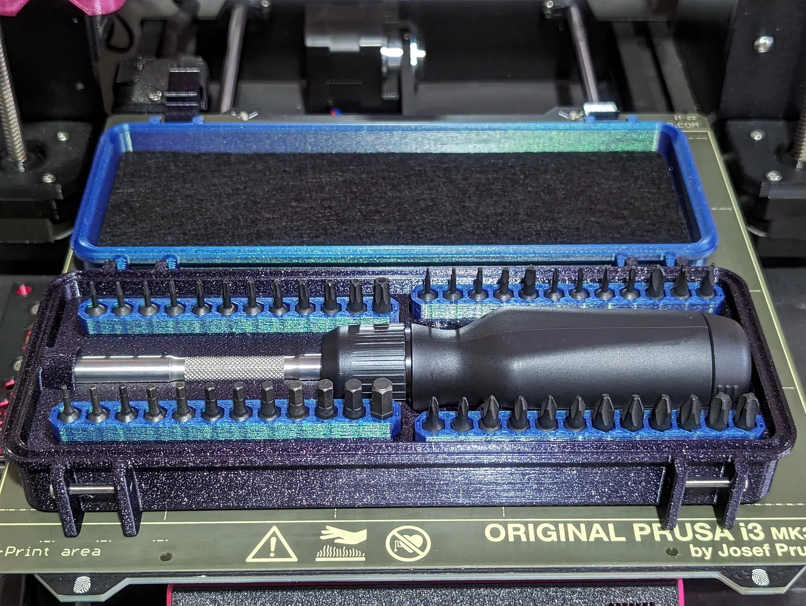 Mọi thứ in ra đều không cần support, cái duy nhất hơi khó khăn là gắn mấy cục nam châm vô cái bản holder đựng bit, mình có đính kèm mấy tấm hình để dễ hình dung. Mình làm bằng cách đổi màu ở lớp 21 trong PrusaSlicer rồi gắn nam châm vô lúc máy dừng lại, làm vậy sẽ dễ hơn nếu bạn có cái bàn in bằng thép vì nó sẽ giữ nam châm cố định trước khi máy in đóng lại. Mình dùng 12 cục vì còn dư nhiều lắm với lại giá cũng rẻ, nhưng có thể bạn chỉ cần dùng 8 cục là được, của mình mua theo gói 50 cục nên xài hết 12 cục thì tốt hơn.