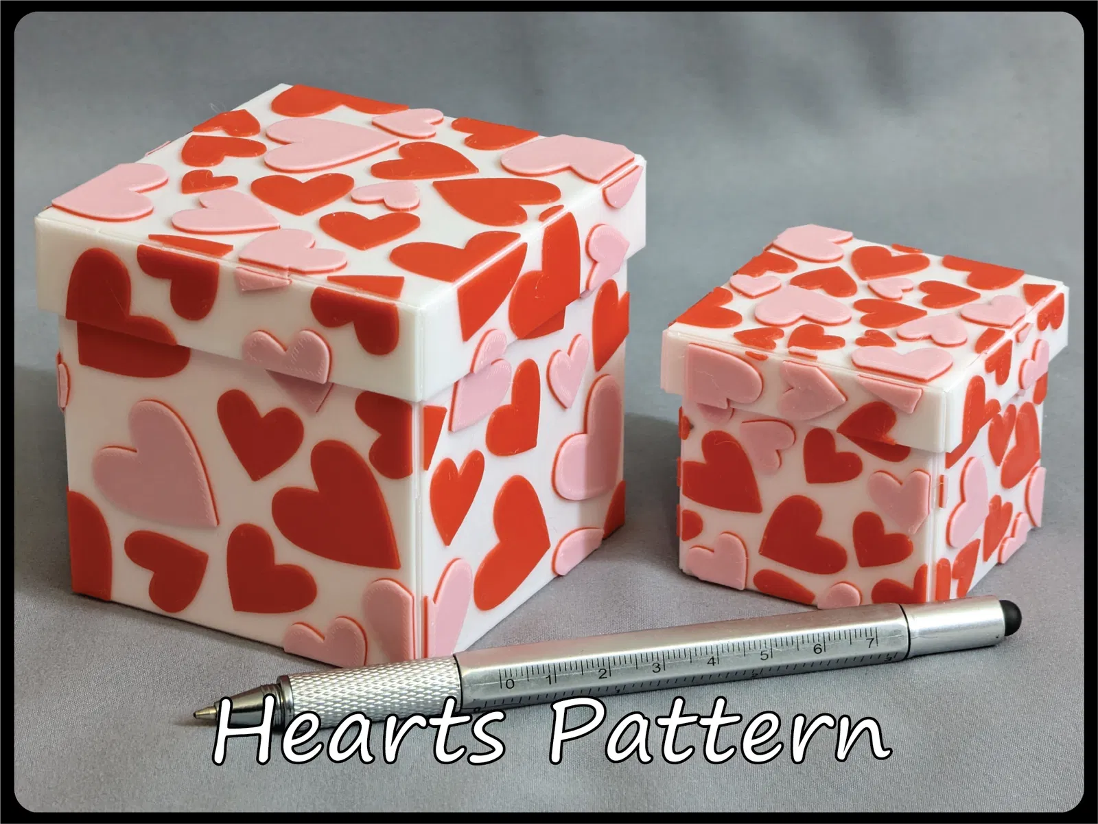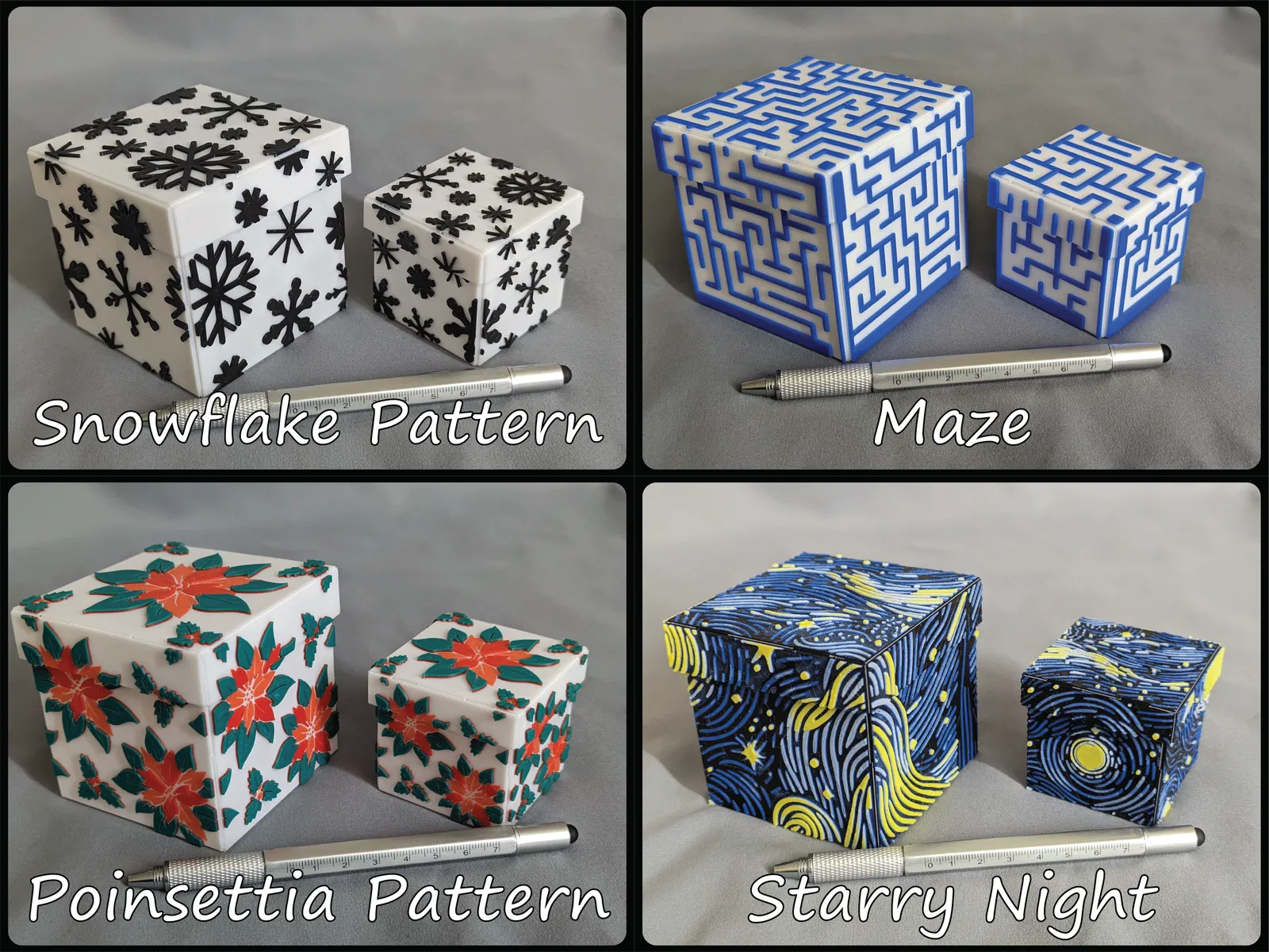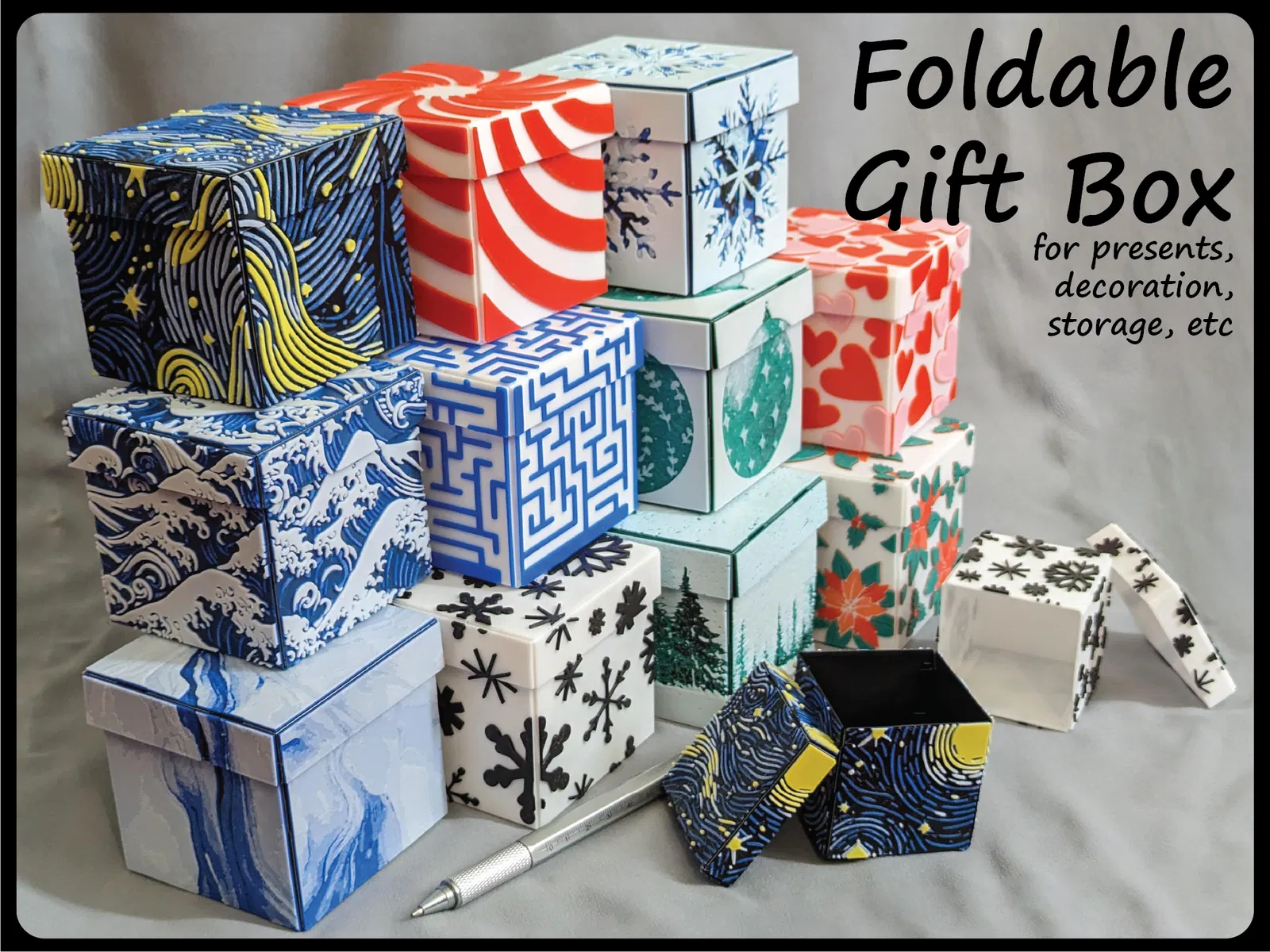 Hộp quà trang trí này có thể gấp lại, không cần keo, băng dính hay ốc vít, in phẳng và tự ghép lại. Có nhiều mẫu mã và hai kích cỡ, sử dụng bản lề nhựa mỏng và các tab để lắp ráp. Có thể tùy chỉnh màu sắc với các mẫu thiết kế từ Hueforge.