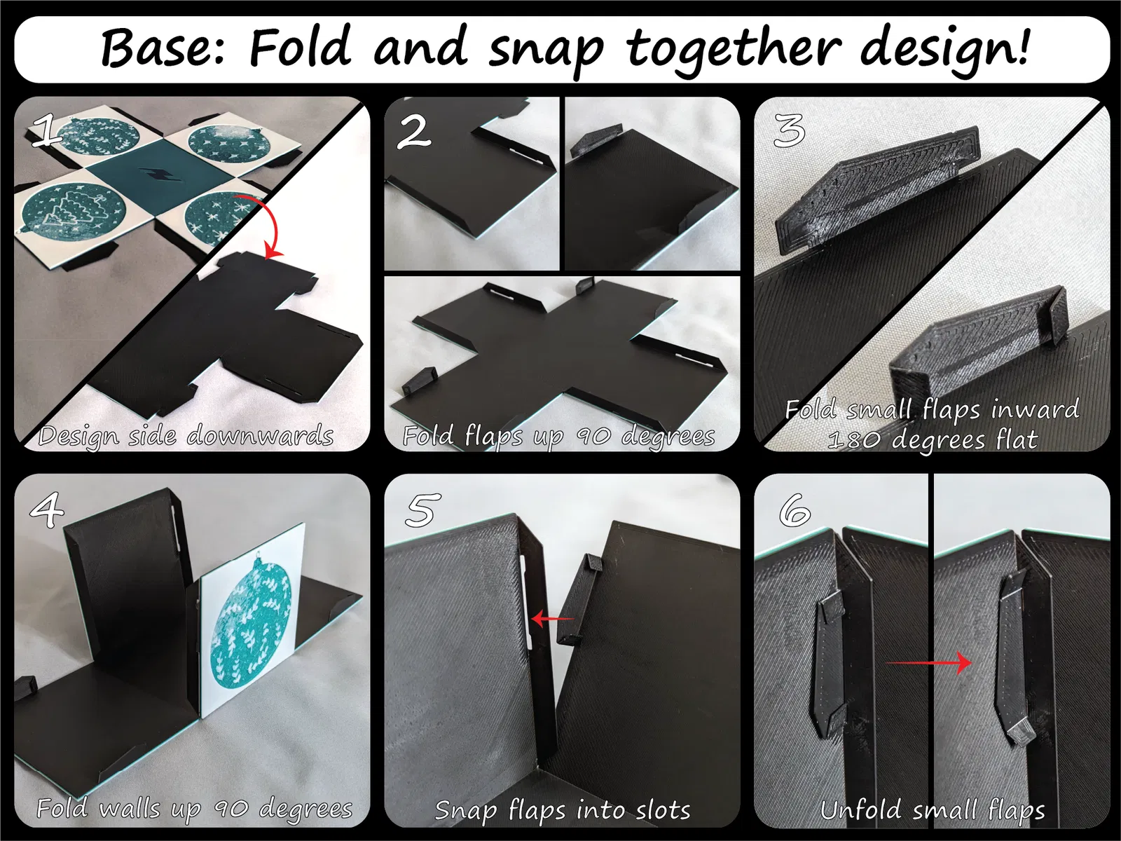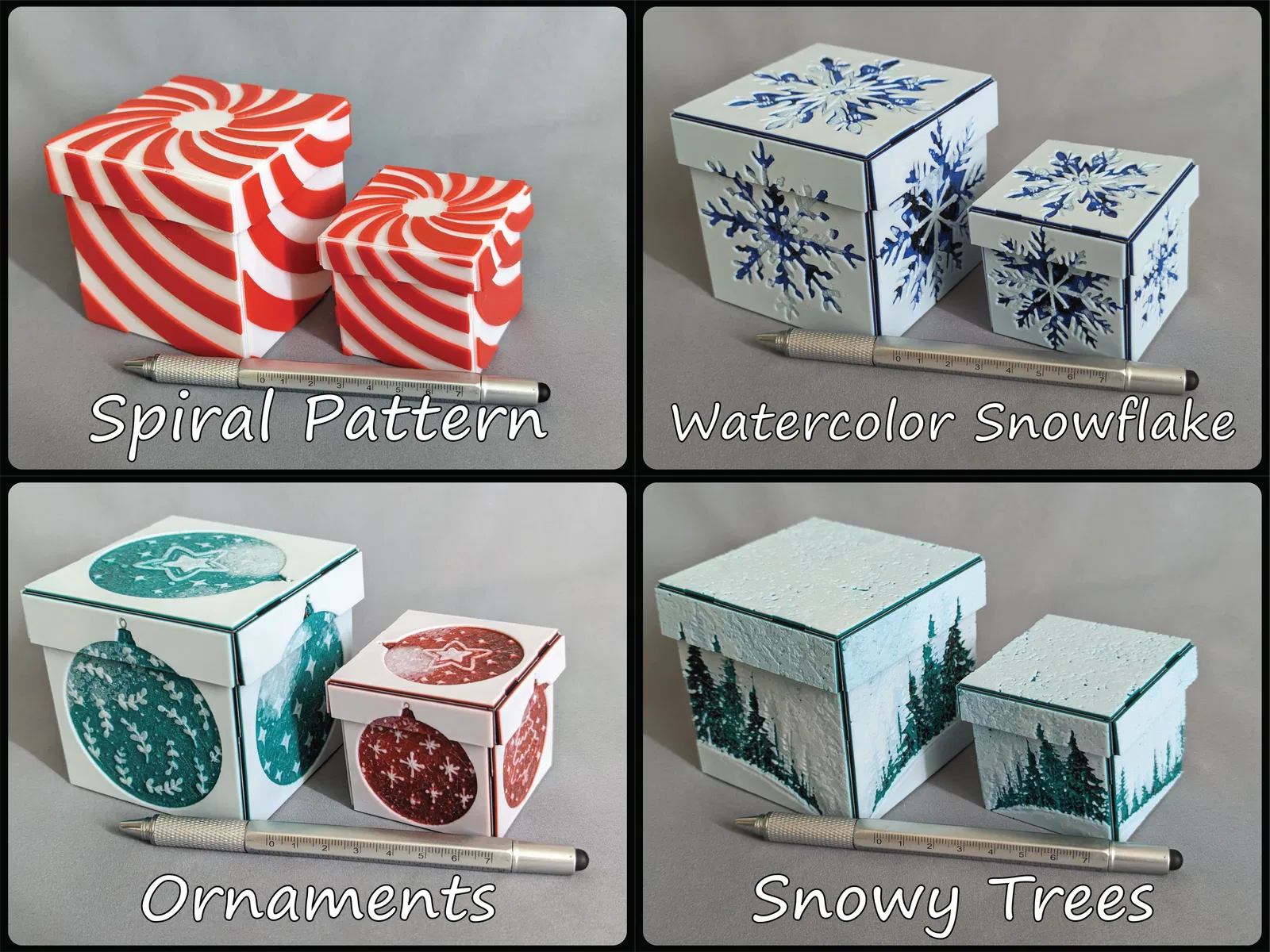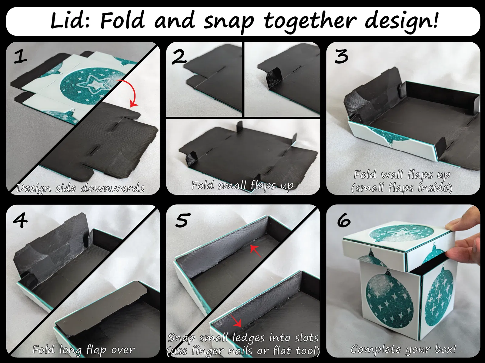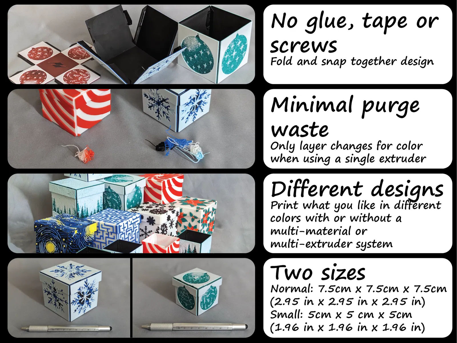 Đây là một hộp quà trang trí có thể gấp lại, bạn có thể dùng để tặng quà nhỏ, trang trí bàn làm việc, để dưới cây thông Noel nhỏ, đựng kẹo, và bất cứ thứ gì bạn có thể nghĩ ra. Thiết kế này bao gồm phần đế hộp và phần nắp khớp với nhau. Tôi thiết kế nó sao cho không cần keo, băng dính hay ốc vít; ít lãng phí vật liệu in; có nhiều mẫu mã để lựa chọn; và hai kích cỡ. Nó sử dụng bản lề nhựa mỏng một lớp và các tab cho phép bạn gấp và ghép chúng lại thành một chiếc hộp chắc chắn (chắc chắn như một lớp nhựa mỏng thôi) và đáng ngạc nhiên là rất bền! Vì nó in phẳng và gấp lại, các thiết kế có thể đến từ Hueforge và chỉ yêu cầu thay đổi màu sợi khi in theo lớp, giúp giảm đáng kể lãng phí vật liệu! Điều này cũng có nghĩa là không cần hệ thống đa vật liệu hoặc đa đầu phun nhưng sẽ hữu ích.