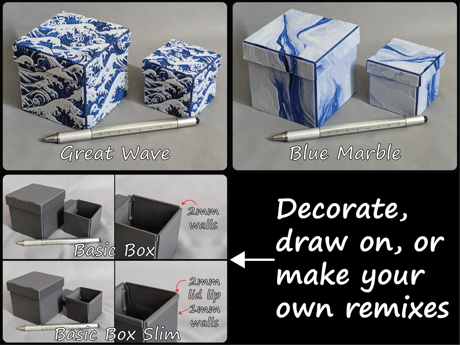 - Hộp cơ bản Mỏng có một gờ 2mm cho nắp và phần còn lại của thành là 1mm cho nhu cầu sửa đổi hoặc dán nhãn của bạn, hãy chọn mẫu đó nếu bạn muốn thêm chiều sâu cho hộp của mình.
