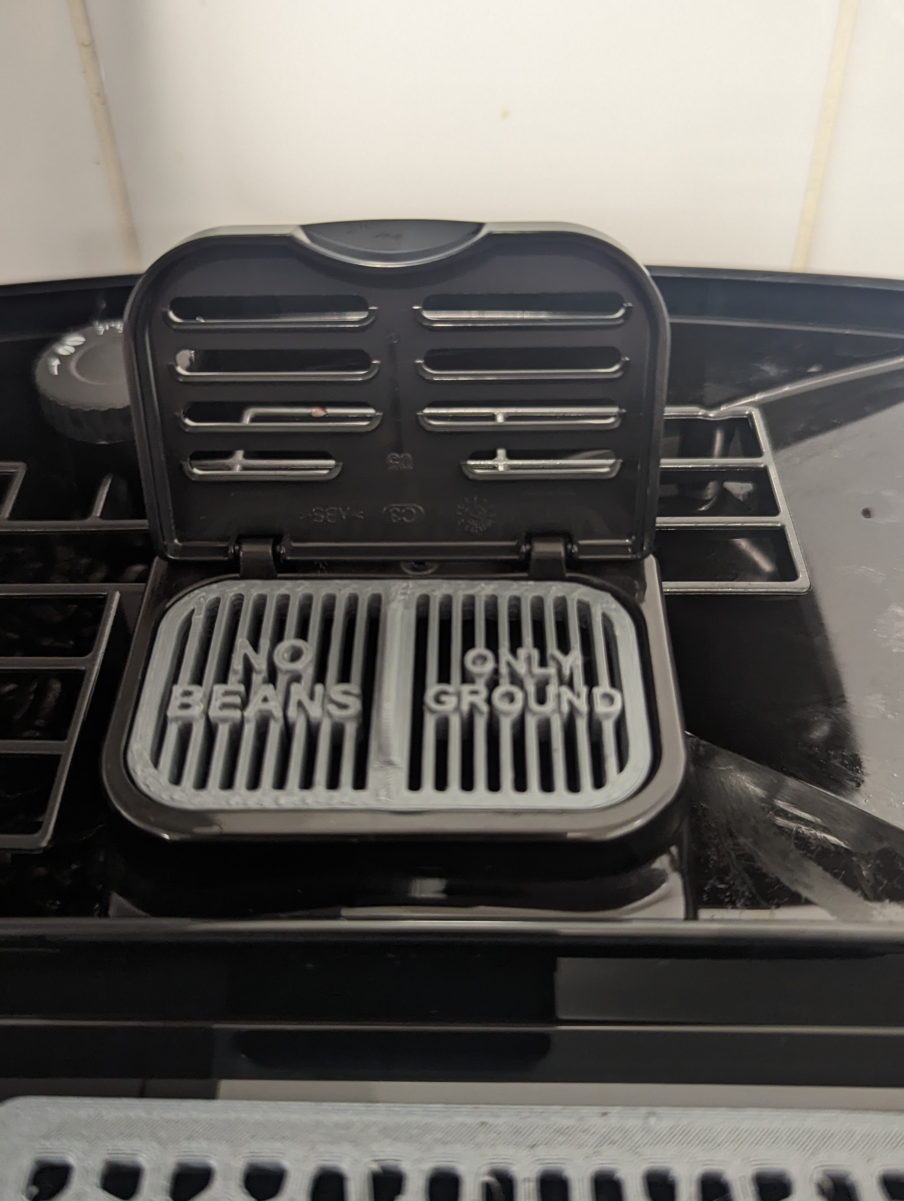 Nắp đậy cho máy DeLonghi Magnifica, nhắc nhở người dùng không cho hạt cà phê vào hộc đựng cà phê xay. Phiên bản này đã được sửa đổi để có lỗ thông hơi.