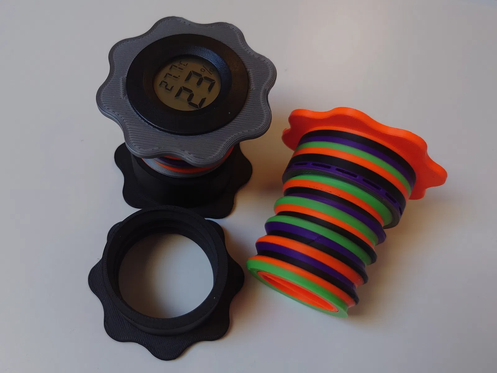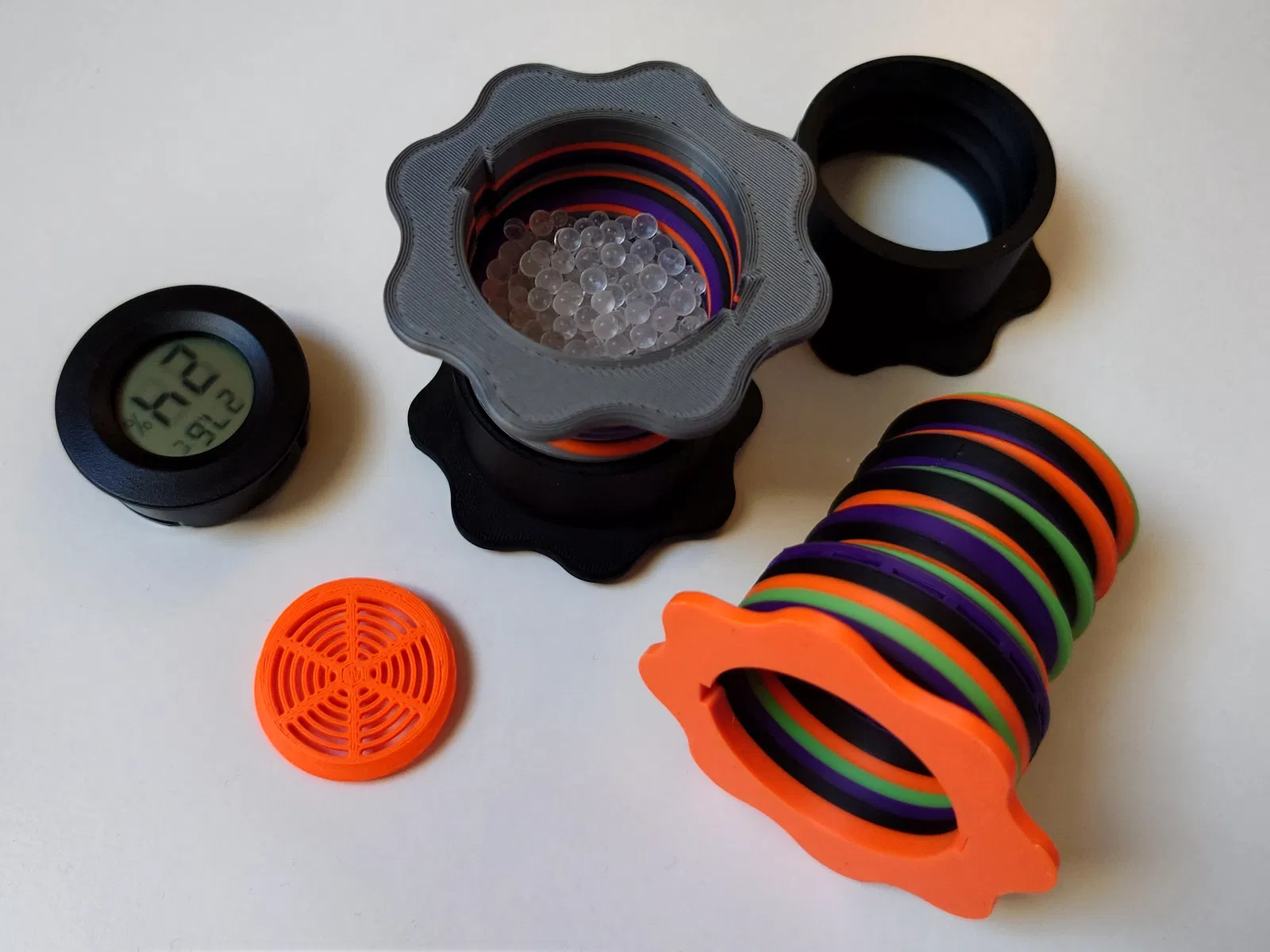 Giá đỡ cuộn có thể điều chỉnh cho Gel Silica (Chất hút ẩm) / Trọng lượng cuộn có tích hợp Máy đo độ ẩm, được thiết kế cho Bambu Lab AMS và Hydra AMS. Giữ cho sợi filament khô ráo hoặc tăng thêm trọng lượng cho cuộn dây. In 3 phần không cần hỗ trợ.