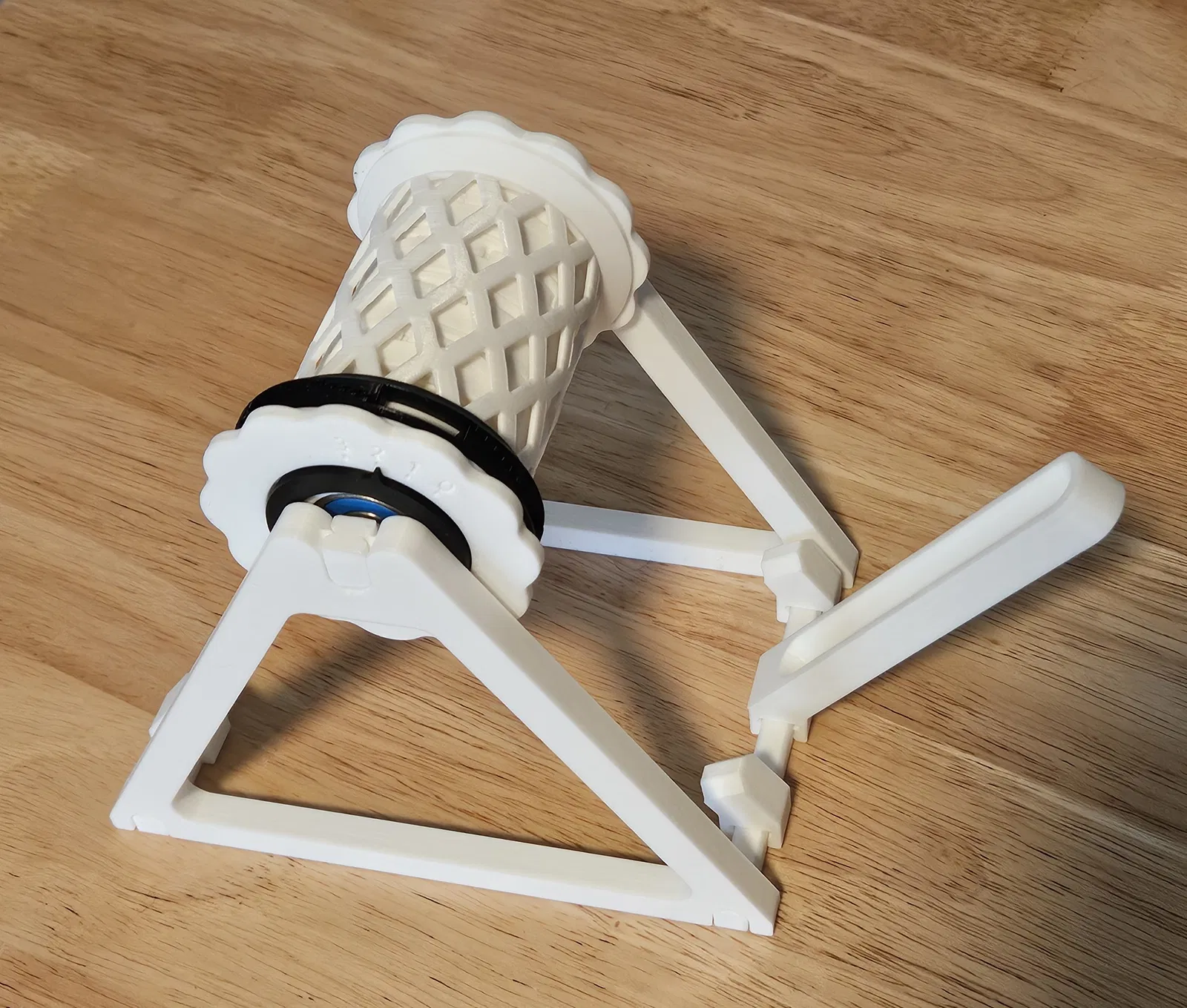 Đây là phiên bản có cấu hình thấp, dễ in và hy vọng là cải tiến của Giá đỡ cuộn dây tự tua lại do Vincent Groenhuis tạo ra.