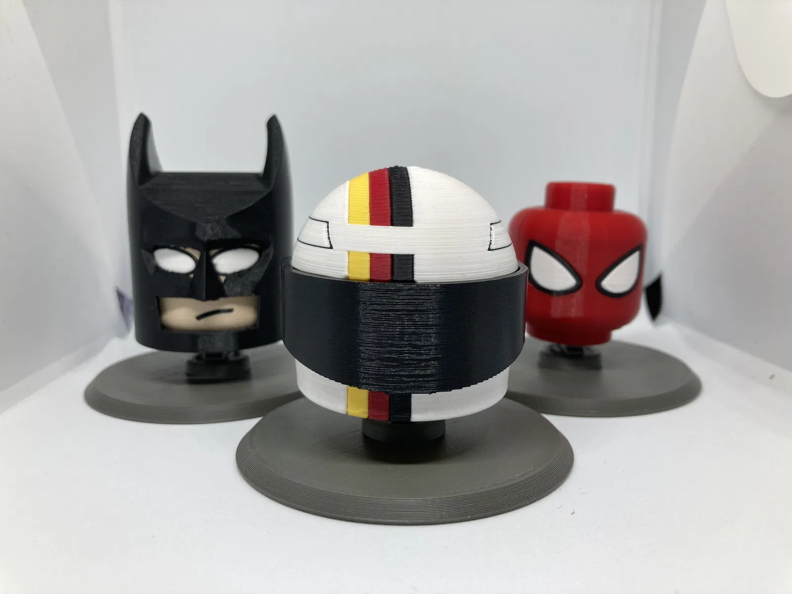 Đây là bản phối lại từ mẫu "Emoji Printer Bobbleheads" của 3D Printy để có thể gắn các đầu xe đua và các nhân vật khác của tôi (mà tôi cũng đã đính kèm trong mẫu này). Do trọng lượng tăng thêm, tôi thấy tốt nhất nên sử dụng lò xo "Cứng" từ mẫu gốc và sử dụng vật liệu có độ đàn hồi cao hơn như PETG hoặc ABS (tôi đã dùng ABS cho mẫu của mình). Tôi đã đính kèm tất cả các đầu xe đua tôi đã tạo cho đến nay và một số mẫu bổ sung mà tôi cũng đã làm trước đây. Ngoài ra còn có một giá đỡ lớn hơn để hỗ trợ tốt hơn cho các đầu lớn, những đầu này cũng sẽ vừa với các kệ trưng bày của tôi mà tôi đang trong quá trình hoàn thiện và sẽ sớm chia sẻ.