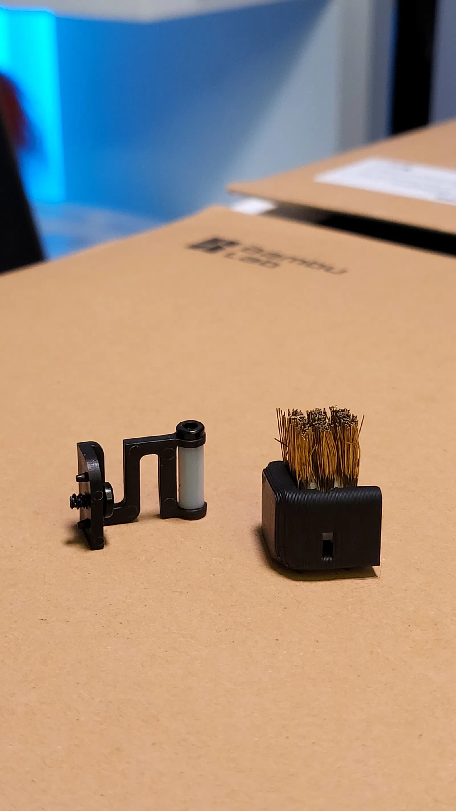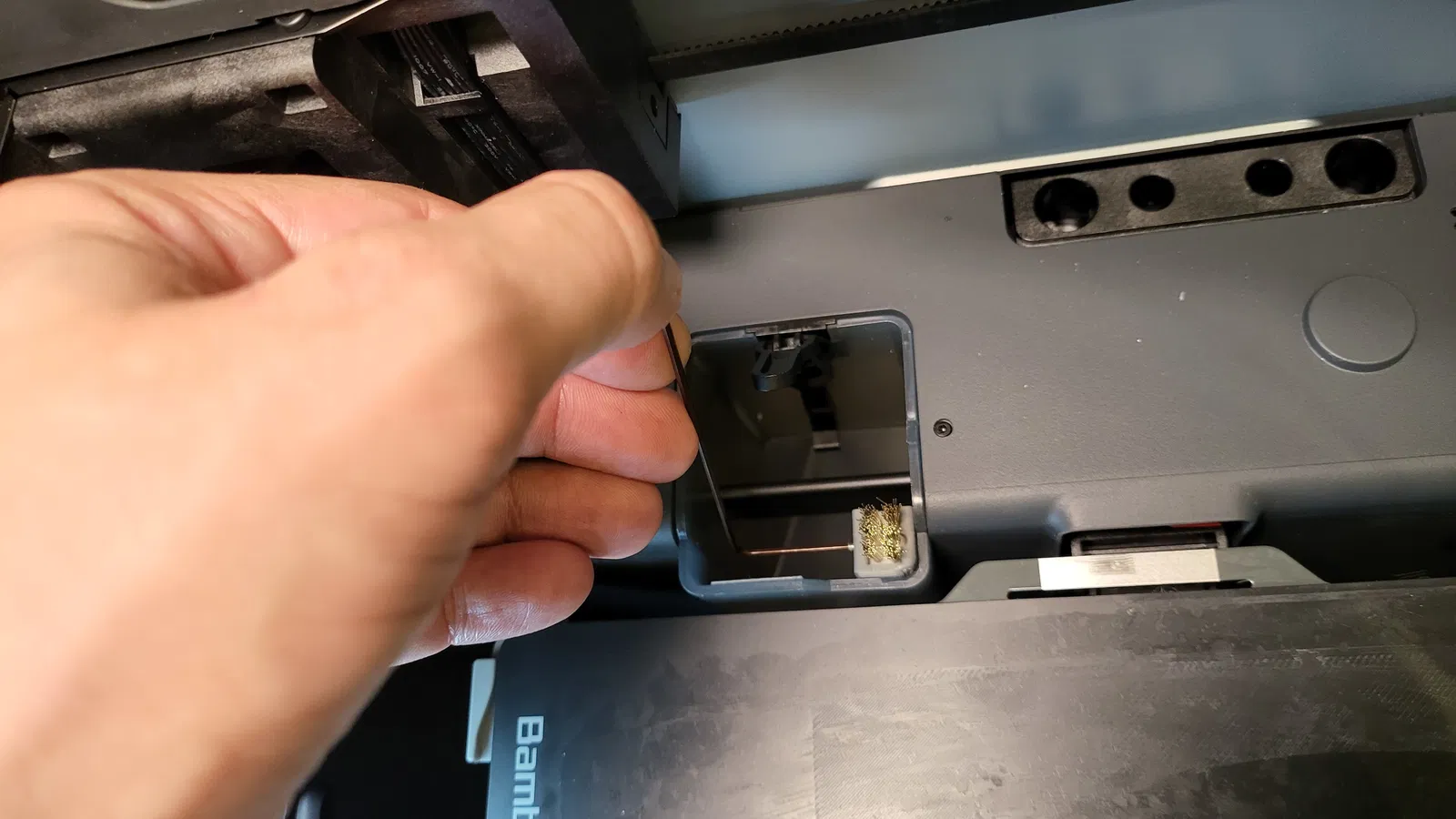 Điều tuyệt vời nhất ở Bambu là một khi bạn nhấn nút in là quên nó đi,,,, và rồi bạn nhận thấy có một ít sợi thừa từ lần in trước bị dính ở bên cạnh vòi phun, cũng như những tiếng ồn đáng sợ mà nó tạo ra khi làm sạch vòi phun khiến tôi không thoải mái và giật mình,,, vì vậy tôi nghĩ tại sao không quay trở lại thời kỳ đồ đá và sử dụng bàn chải đồng…