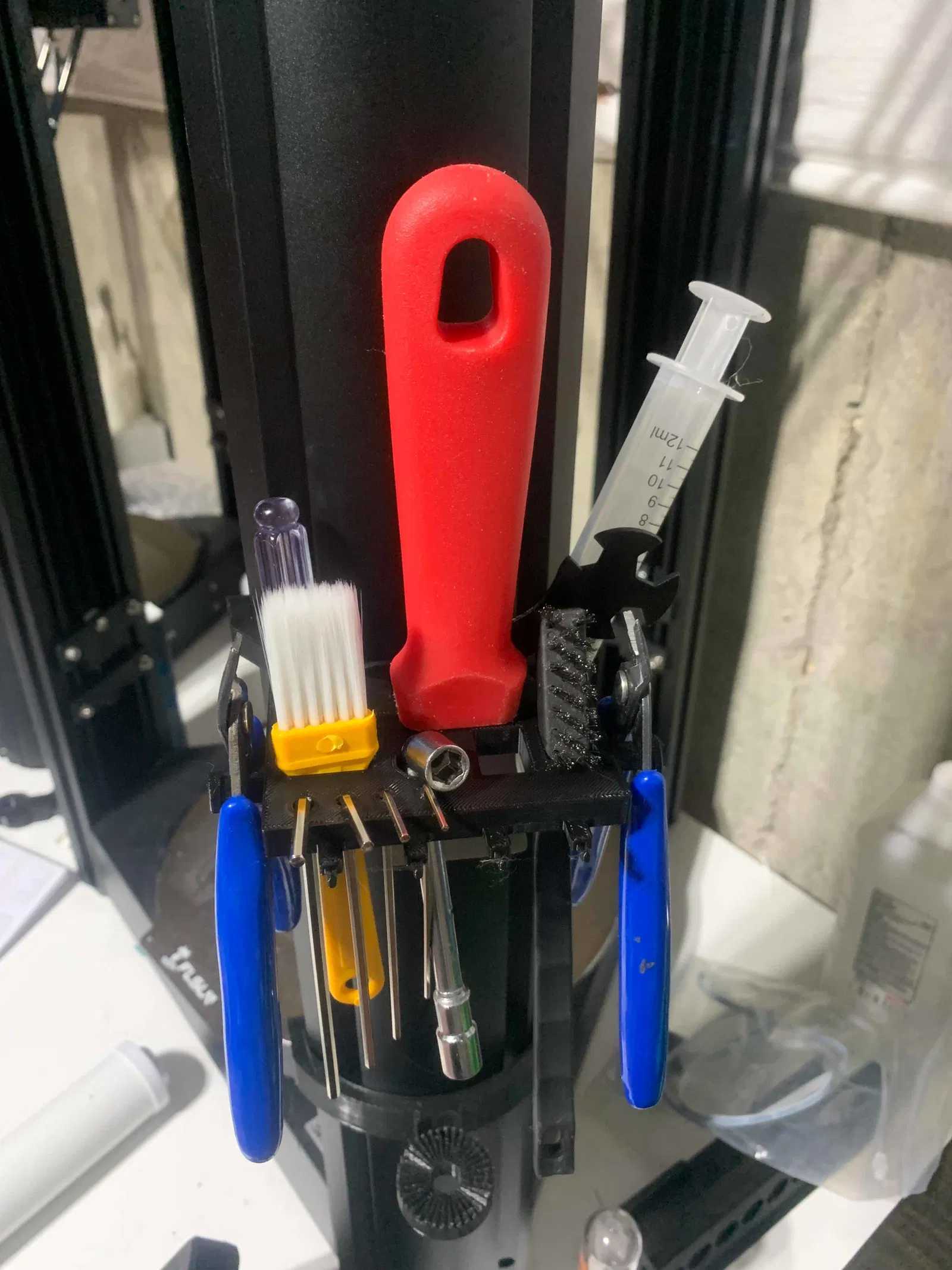 Vì tôi chưa thấy có giá đỡ dụng cụ nào tốt cho V400, nên tôi đã tự tạo ra một cái. Mẫu này được lấy cảm hứng từ một vài mẫu khác đang có trên mạng dành cho Super Racer. Đây không phải là bản chỉnh sửa, vì nó được tôi tự xây dựng từ đầu bằng SketchUp. Tôi đã cố gắng bao gồm nhiều loại lỗ, khe cắm và móc treo khác nhau, vì mỗi người có sở thích để đồ khác nhau. Nó có thể chứa được nhiều thứ, như bạn có thể thấy trong một bức ảnh với chiếc của tôi đã được tải gần đầy.