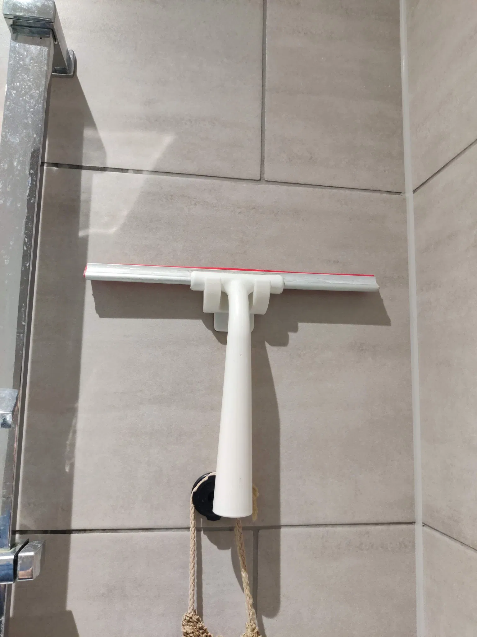 Đó là một giá treo cho cây gạt nước của IKEA với một đế của đĩa gắn gopro, vì vậy có thể sử dụng cùng một miếng dán 3m để gắn. Lý do là những miếng dán đó thì rẻ để mua và tôi đã có rất nhiều. Đồng thời, chúng sẽ không dễ dàng bị bong ra và sẽ không làm hỏng gạch.