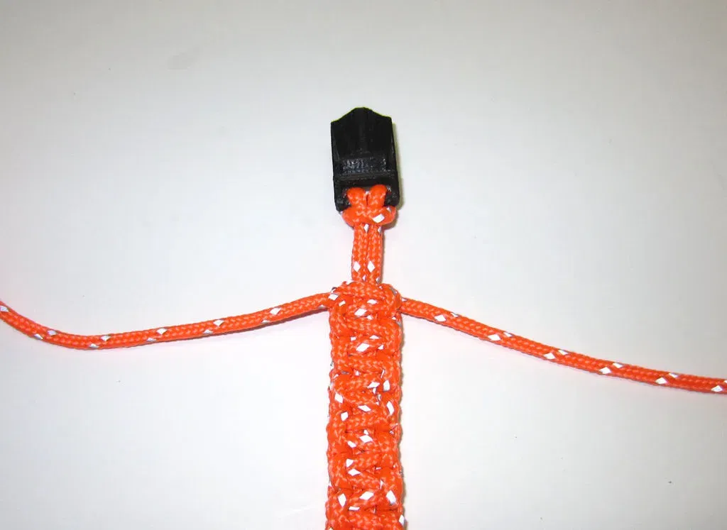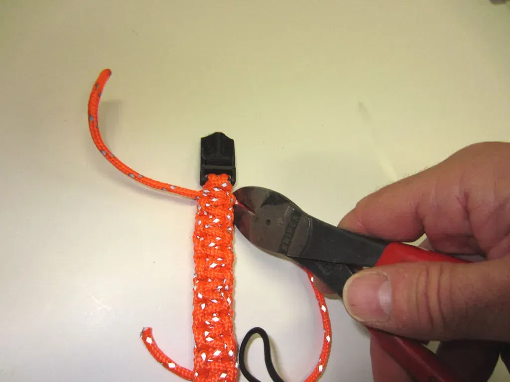 Khi bạn in các khóa nam và nữ, hãy cách chúng khoảng 7.5 - 8 inch ở các lỗ mở và theo dõi các bức ảnh để dệt dây paracord. QUAN TRỌNG: Hãy chắc chắn rằng mỗi nút tiếp theo thay đổi bên nào nằm dưới hai dây chính. Bạn phải thay đổi qua lại, nếu không vòng tay sẽ bị xoắn. Khi bạn hoàn thành nút cuối cùng, cắt tỉa các dây và nhẹ nhàng đốt cháy các đầu bằng bật lửa để giữ chúng ở vị trí.