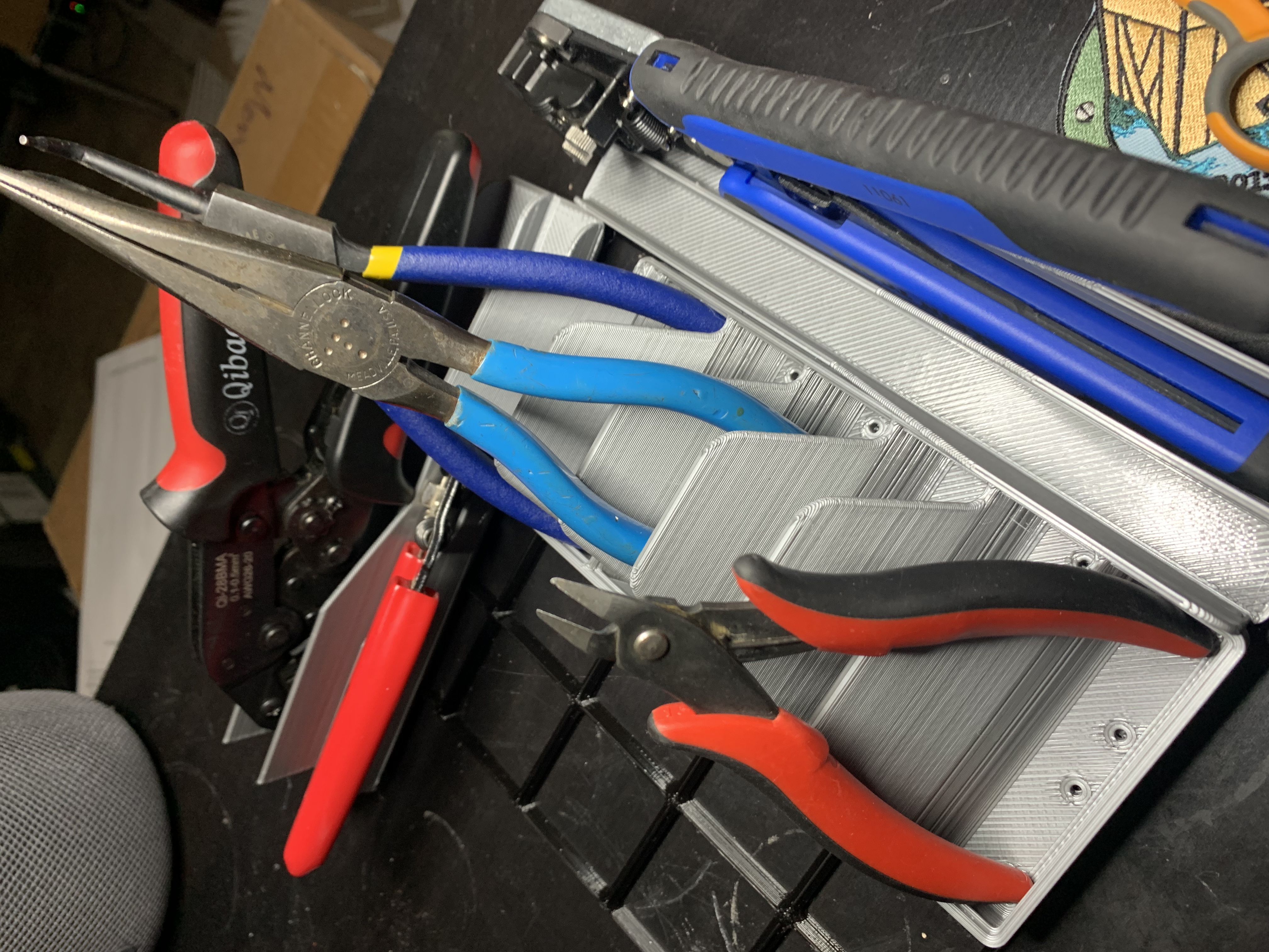 Giá đỡ kìm cắt: Chứa sáu dụng cụ cách tay cầm khoảng 80mm. Nếu dụng cụ có lò xo, phần khoét rỗng sẽ giữ cho nó không bị rơi ra. Khối này có thể được gắn ngang để chứa năm dụng cụ.