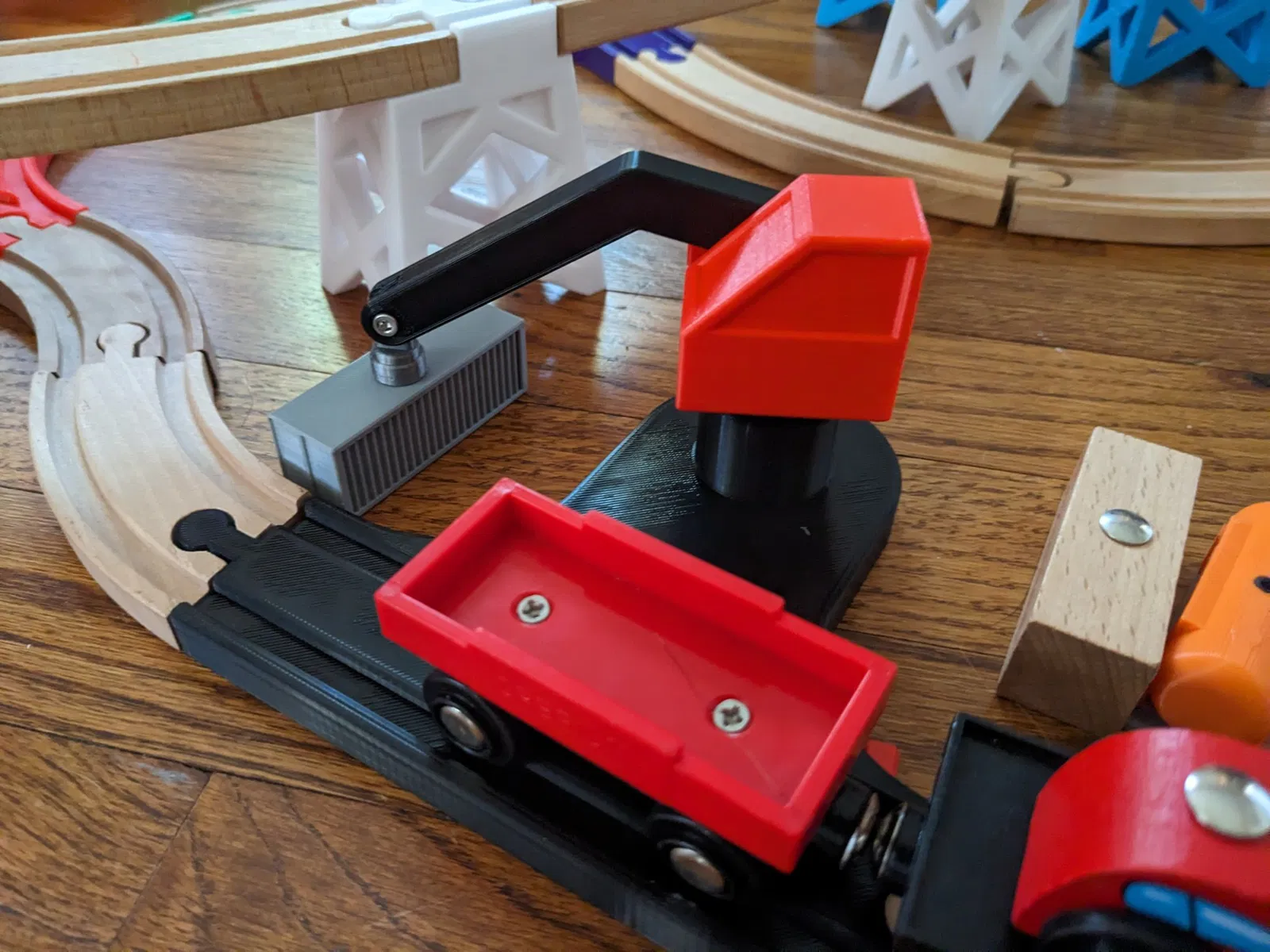 Một cần cẩu nhỏ cho Brio, Ikea hoặc các loại tàu gỗ khác. Nó dựa trên một đoạn đường ray thẳng tiêu chuẩn 150mm. Phần cứng cần thiết để lắp ráp: - 3x vít M3 (Tôi đã sử dụng 6mm, 15mm và 20mm, nhưng chiều dài cần thiết khá linh hoạt)