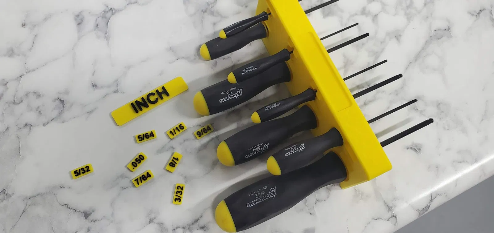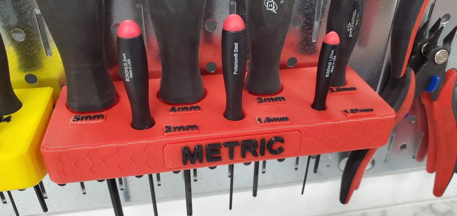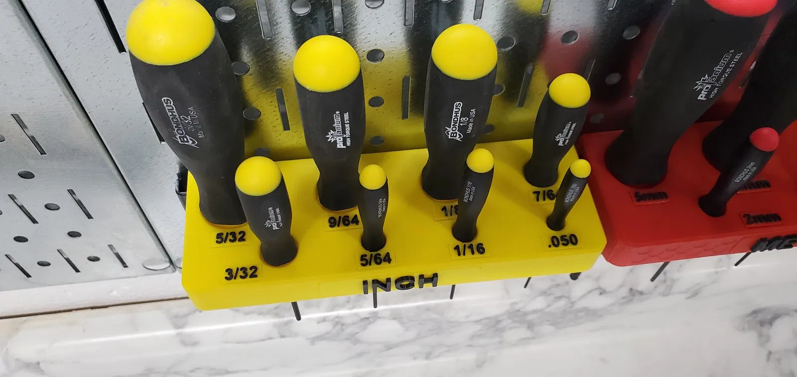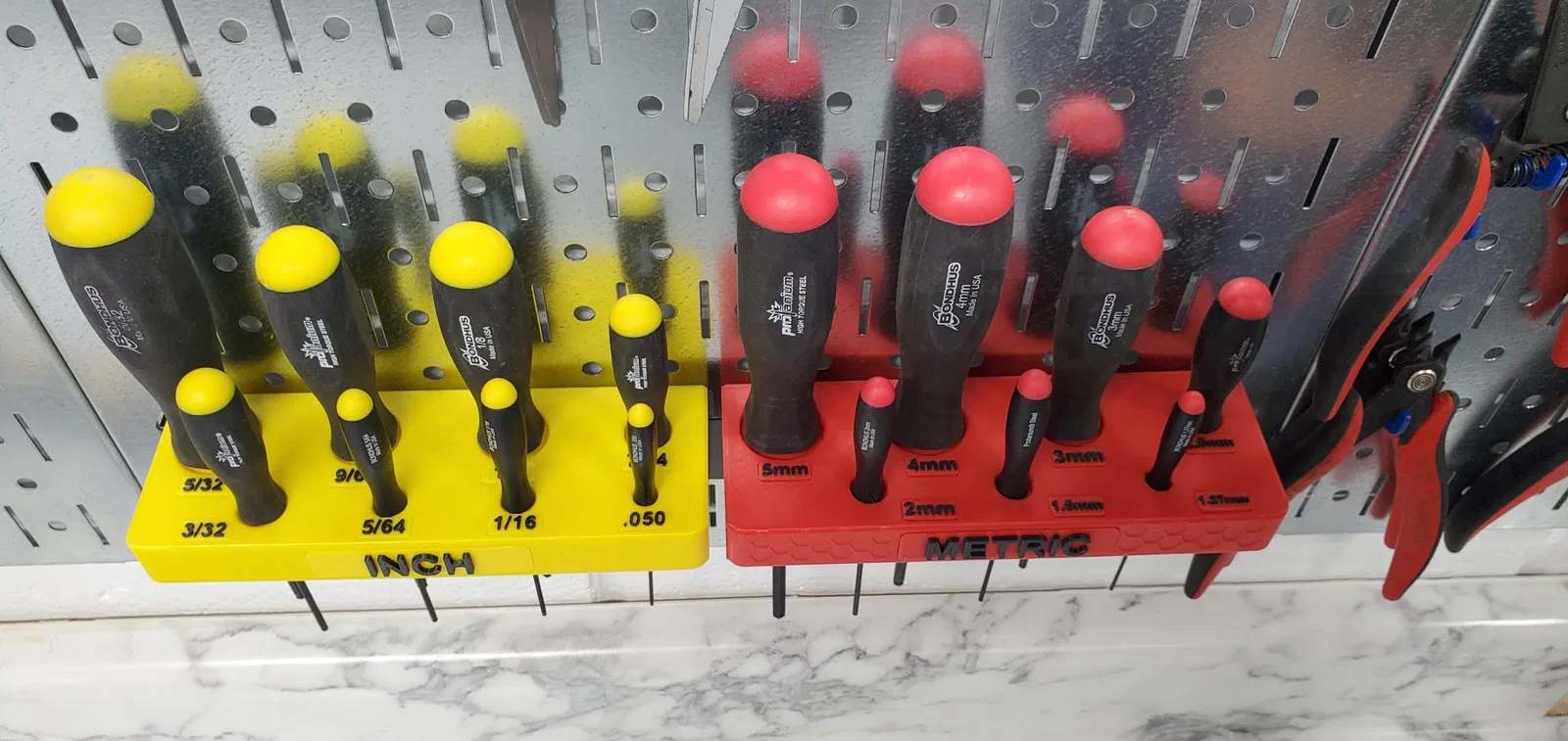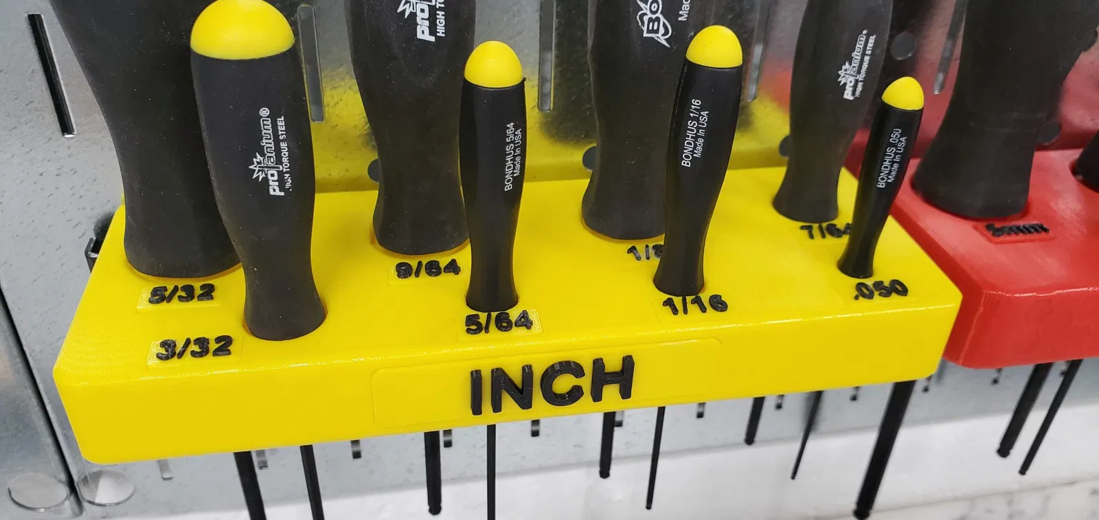 Treo mấy cây lục giác Bondhus ProTanium lên bảng treo đồ Wall Control của bạn nè. Dùng được cho cả hệ Metric với Inch luôn nha. Mấy cái nhãn thì in riêng, có thể dùng kỹ thuật đổi màu/sợi in luôn đó. Mấy cái nhãn này thì dán lên sau khi in xong nha.