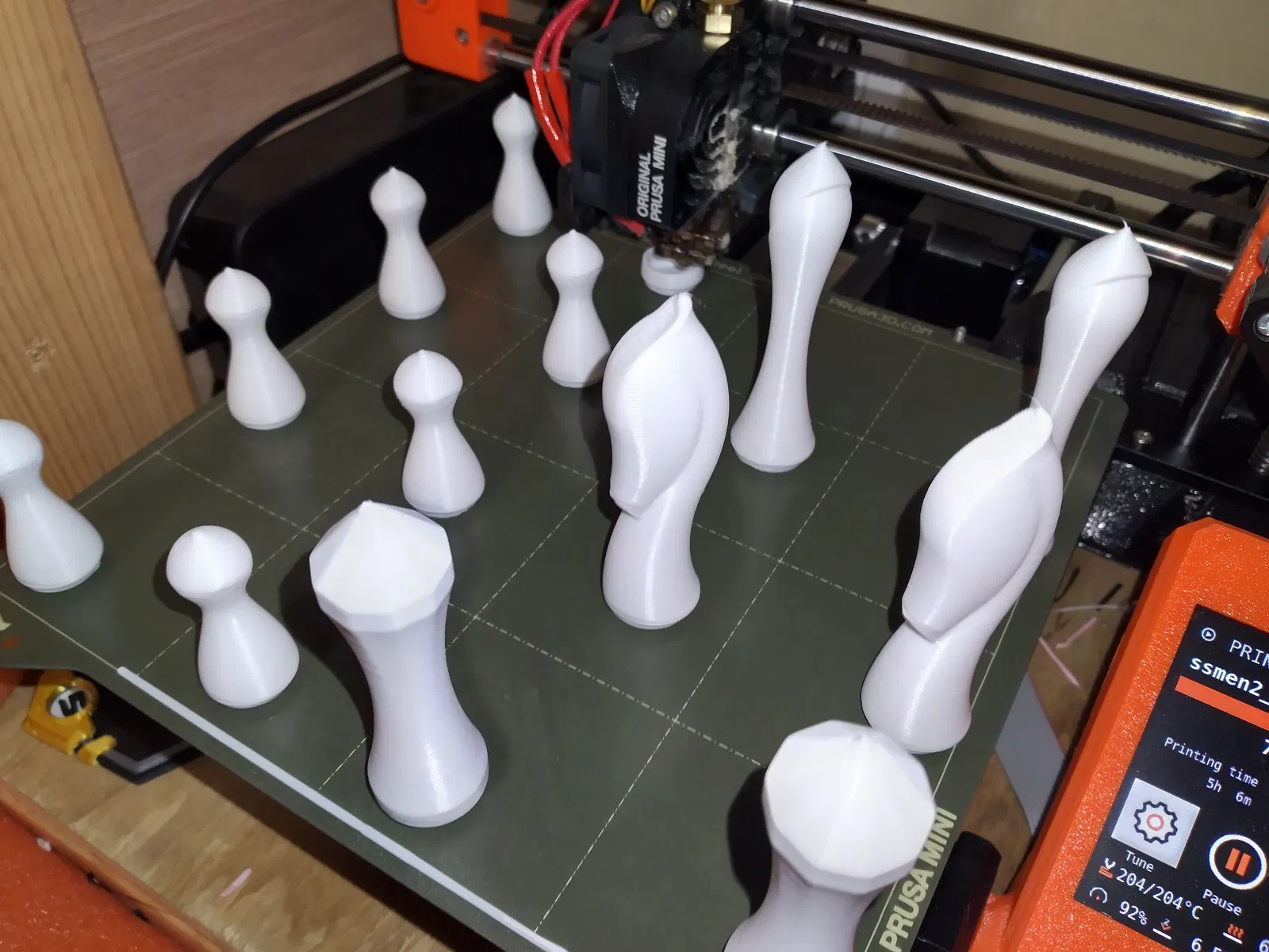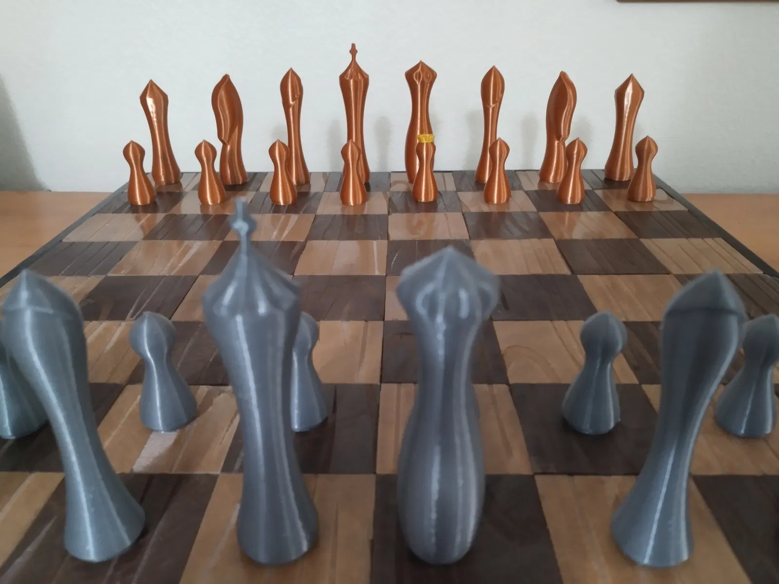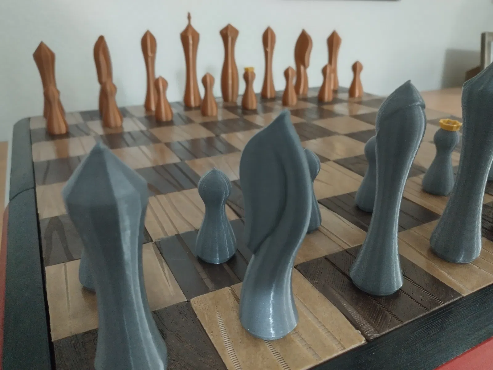 Robbert Bakker đã tạo mô hình từng quân cờ riêng lẻ nhưng để lại một số chi tiết về việc sản xuất thành công cho trí tưởng tượng. Sau đó, anh ấy biến mất khỏi Trái Đất một thời gian.ootnote{Chẳng bao lâu sau khi xuất bản thiết kế này vào khoảng năm 2017, Robbert đã biến mất khỏi MyMiniFactory và không trả lời các câu hỏi của tôi vào năm 2023. Anh ấy đã hồi sinh trên Printables vào đầu năm 2024 với tên Rossero Bertolli.}. Vì vậy, tôi đã tạo ra một cách sắp xếp các quân cờ phù hợp và điều chỉnh cài đặt in của chúng để có thẩm mỹ tốt. Tôi cung cấp ở đây cách sắp xếp và các cài đặt đó, dưới dạng dự án PrusaSlicer. Các cài đặt mà tôi coi là quan trọng nhất là: * Chế độ bình hoa xoắn ốc (Spiral vase mode)
