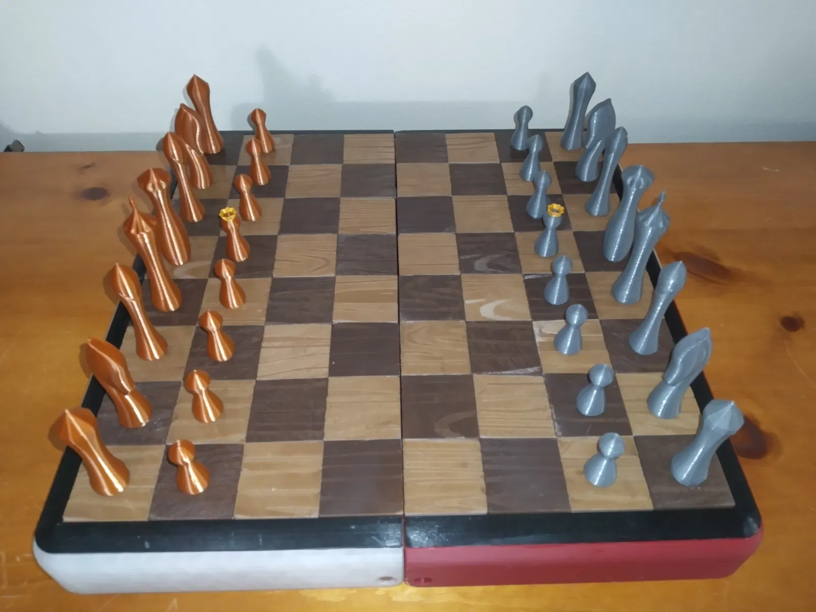 - Tốc độ in tối thiểu: 1 mm/s Đội quân được chia thành hai lần in, một cho mỗi hàng, để bố trí các quân cờ đủ xa nhau nhằm tránh va chạm trên bàn in 180x180. In hai đội quân với các màu tương phản. Ví dụ: Đồng với màu xám kim loại, hoặc trắng với đen truyền thống. Sau đó, dán các quân cờ hàng sau lên đế có trọng lượng bằng đồng xu của tôi. Khi bạn thăng cấp một quân tốt lên hậu trong khi quân tốt ban đầu vẫn còn trên bàn cờ, một quy ước phổ biến là lật ngược một quân xe để sử dụng làm quân hậu thứ hai. Các quân xe có đỉnh nhọn của bộ này không phù hợp cho việc đó. Hãy in một quân hậu thứ hai thay thế, hoặc tốt hơn nữa, hãy sử dụng vương miện cho quân tốt của tôi. Nếu bạn cần một bàn cờ để chơi, hãy xem xét bàn cờ mô-đun hoặc hộp bàn cờ vân gỗ của tôi. Để có thêm các quân cờ cần thiết cho các biến thể cờ vua không chính thống hoặc "cổ điển", hãy xem Bản mở rộng Cờ vua Người đưa thư và các thiết kế cờ vua khác của tôi. ### Giấy phép Chọn một trong hai: * Giấy phép gốc của Robbert: MyMiniFactory - Ghi công - Phái sinh - Phi thương mại