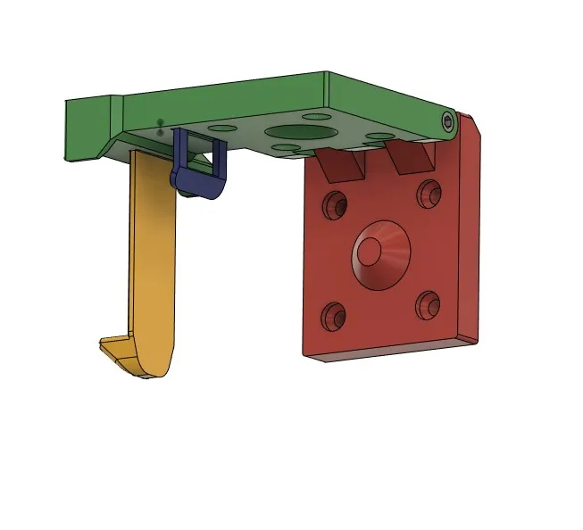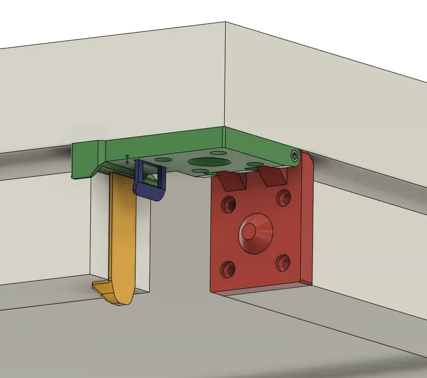 - Lẫy khóa bản lề chân cần được lắp từ mặt dưới (mặt gắn vào bàn). Điều này sẽ giữ lẫy cố định. Tham khảo hình ảnh để biết cách định hướng (nó chỉ vừa theo một hướng). Bạn có thể cần chà nhám lẫy một chút để loại bỏ mọi lỗi in vì nó vừa khít.
