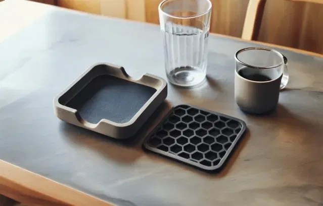 - Giá Đỡ Tiện lợi: Giữ các đế lót ly ngăn nắp và dễ dàng lấy.