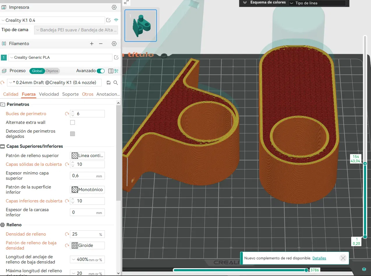 In bằng PLA với 6 lớp vỏ, 30% infill hình sao, độ dày lớp 2.8mm, không cần vật liệu hỗ trợ.