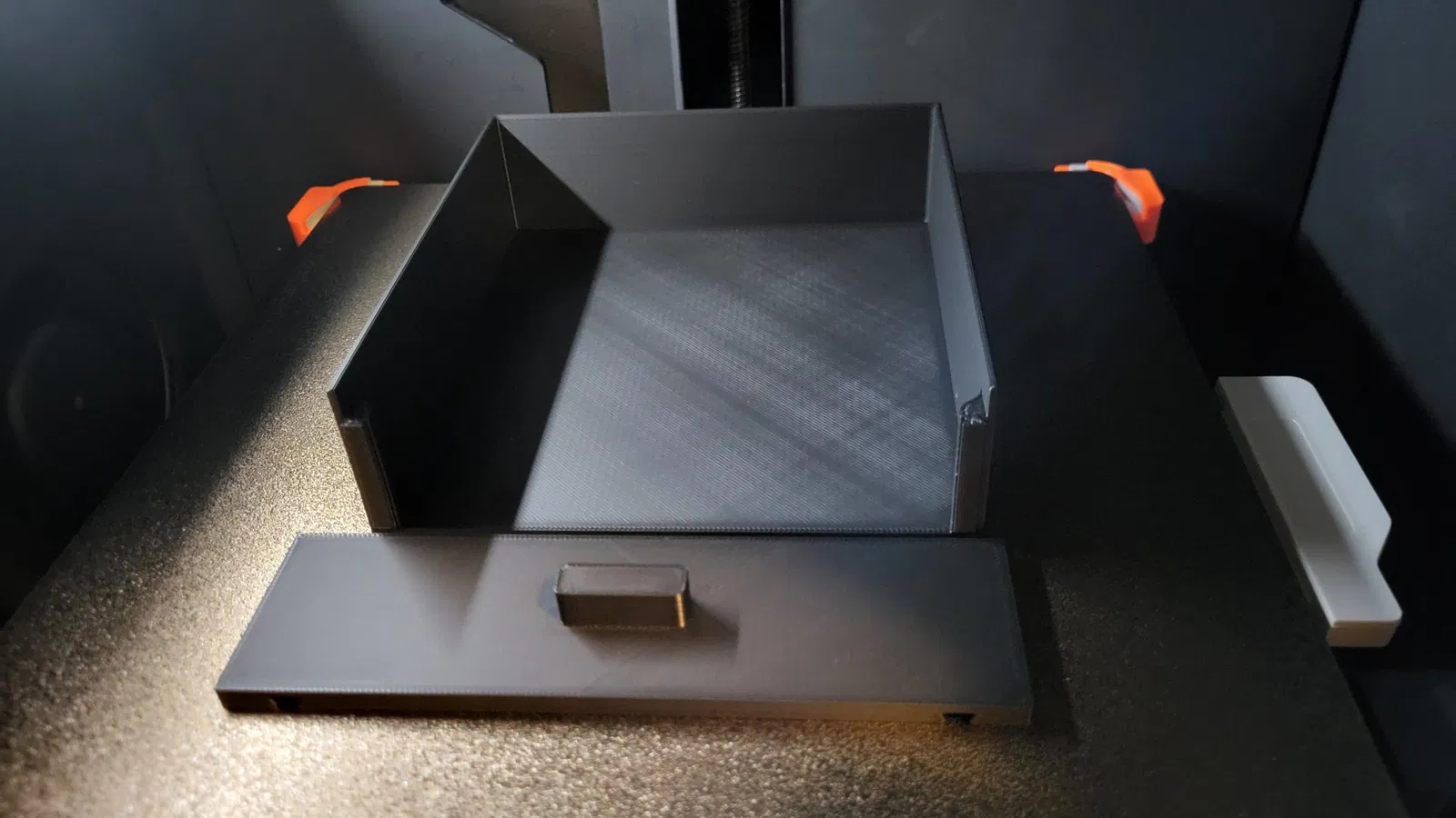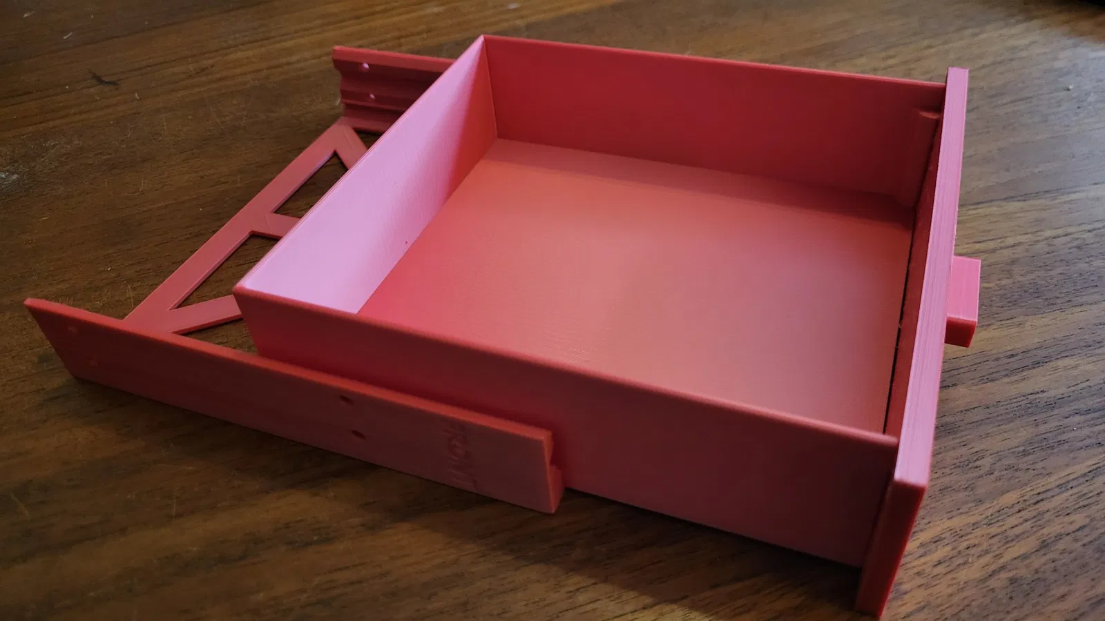 - Hầu hết các thiết kế ngăn kéo PC mà mình thấy thì có một cái hộp và một cái ngăn kéo lồng vô. Theo mình thì hao nhựa không cần thiết. Cái này đơn giản là có mấy cái cục nhỏ hai bên hông ngăn kéo, nó trượt theo cái rãnh trên cái khung gắn. Mấy cục này giữ cho ngăn kéo đi đúng đường, không bị nghiêng hay tuột ra quá xa. Thiết kế này cũng cho phép cái ngăn kéo to hơn.