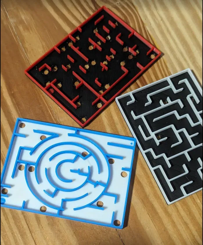 Tui mới làm cho mấy file gốc nhỏ lại để 3 cái có thể xếp vừa vào hộp Altoids. Tui đang chờ mấy viên bi vòng bi cỡ 2mm để thử, mà tui nghĩ cỡ đó là ổn áp. Tải về file STL để in mê cung cho hộp Altoids của bạn ngay thôi!