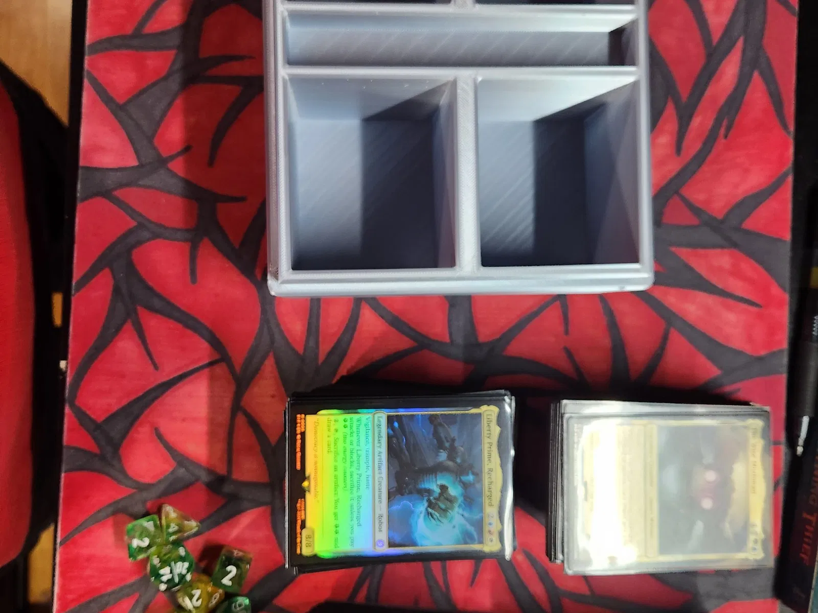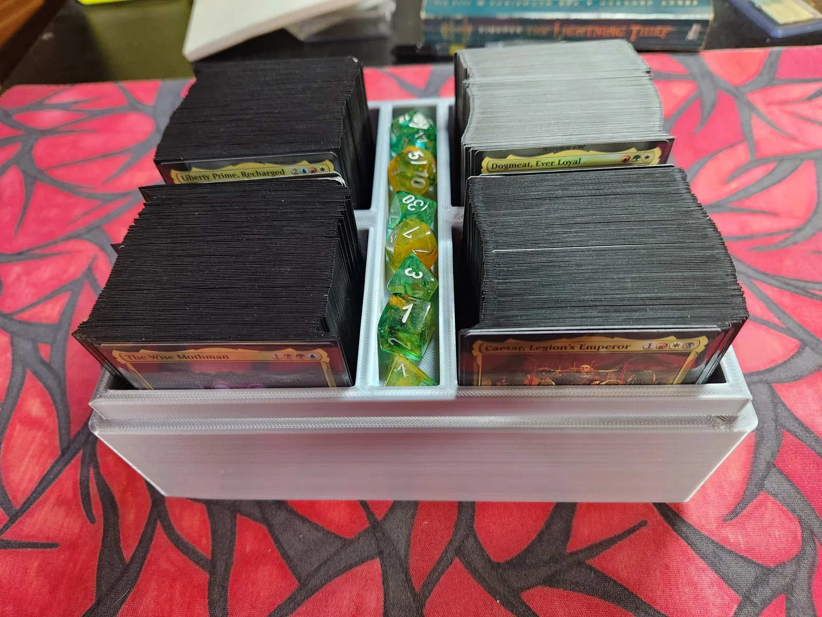 Hộp đựng bài này được thiết kế đặc biệt để chứa cả 4 bộ bài Commander Fallout, với một ngăn nhỏ ở giữa để đựng xúc xắc hoặc các quân cờ. Nắp hộp có biểu tượng phóng xạ độc đáo, được thiết kế để in riêng và bạn có thể tùy chỉnh kích thước để dễ lắp ráp hơn.
