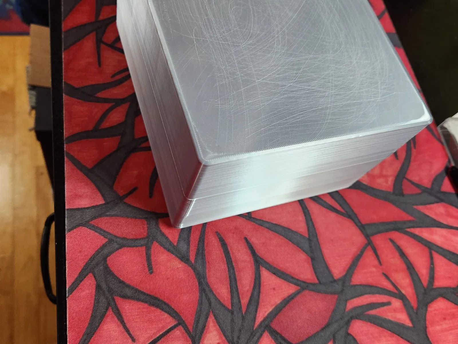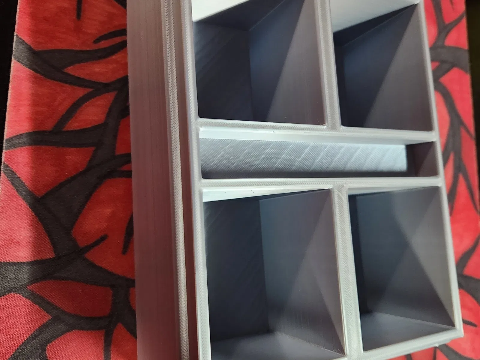 Các khe để đặt bộ bài được thiết kế cho loại bài 1 lớp bọc mỏng, có một khe nhỏ ở giữa để đựng xúc xắc hoặc các quân cờ nhỏ.