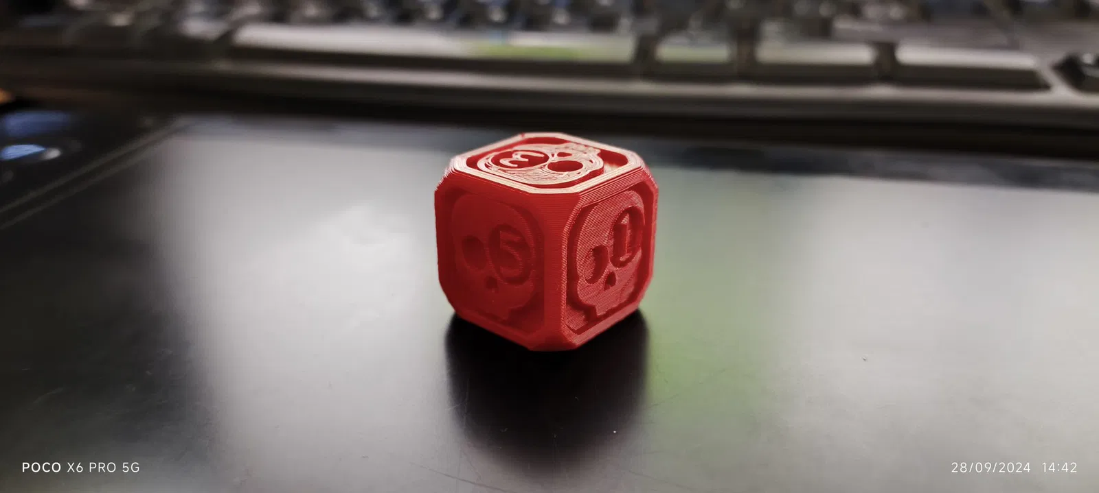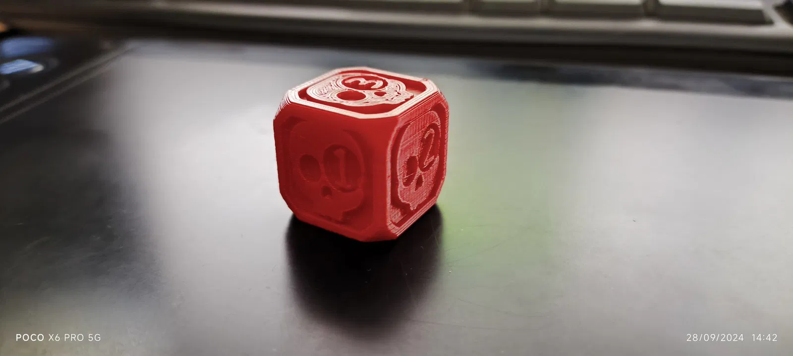 Xúc xắc 2cm có thể phóng to, nếu thu nhỏ lại có thể làm mất chi tiết đầu lâu, được in bằng PLA với máy Artillery Genius, lý tưởng cho dịp Halloween.
