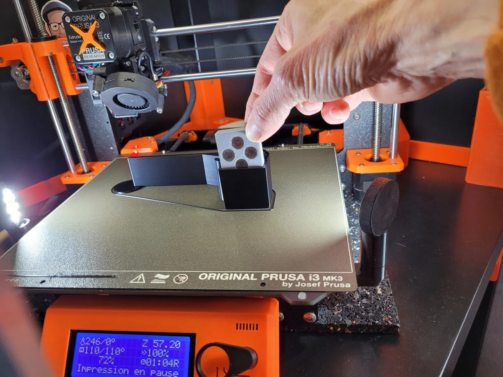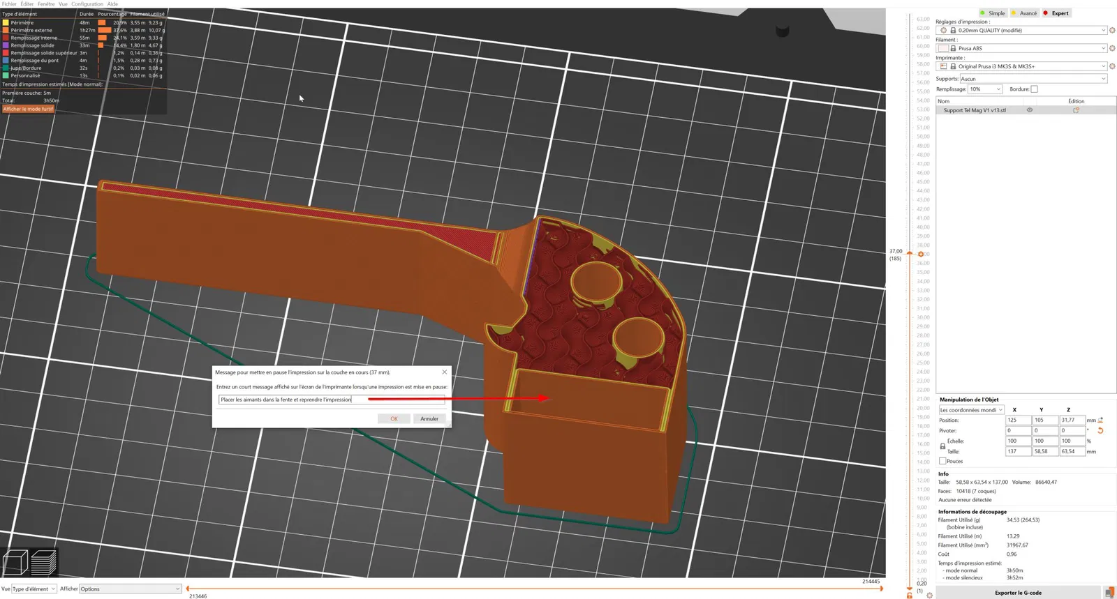 Mấy bạn chỉ cần thêm lệnh tạm dừng in (.stl) ngay trước khi đóng khe nhét nam châm là được. (Hồi đó mình cũng tính nhét nam châm vô thẳng trước khi in tiếp, nhưng sợ nó bị hút dính vô đầu phun (Nozzle X) vì từ tính, tội nghiệp cái đầu phun!).