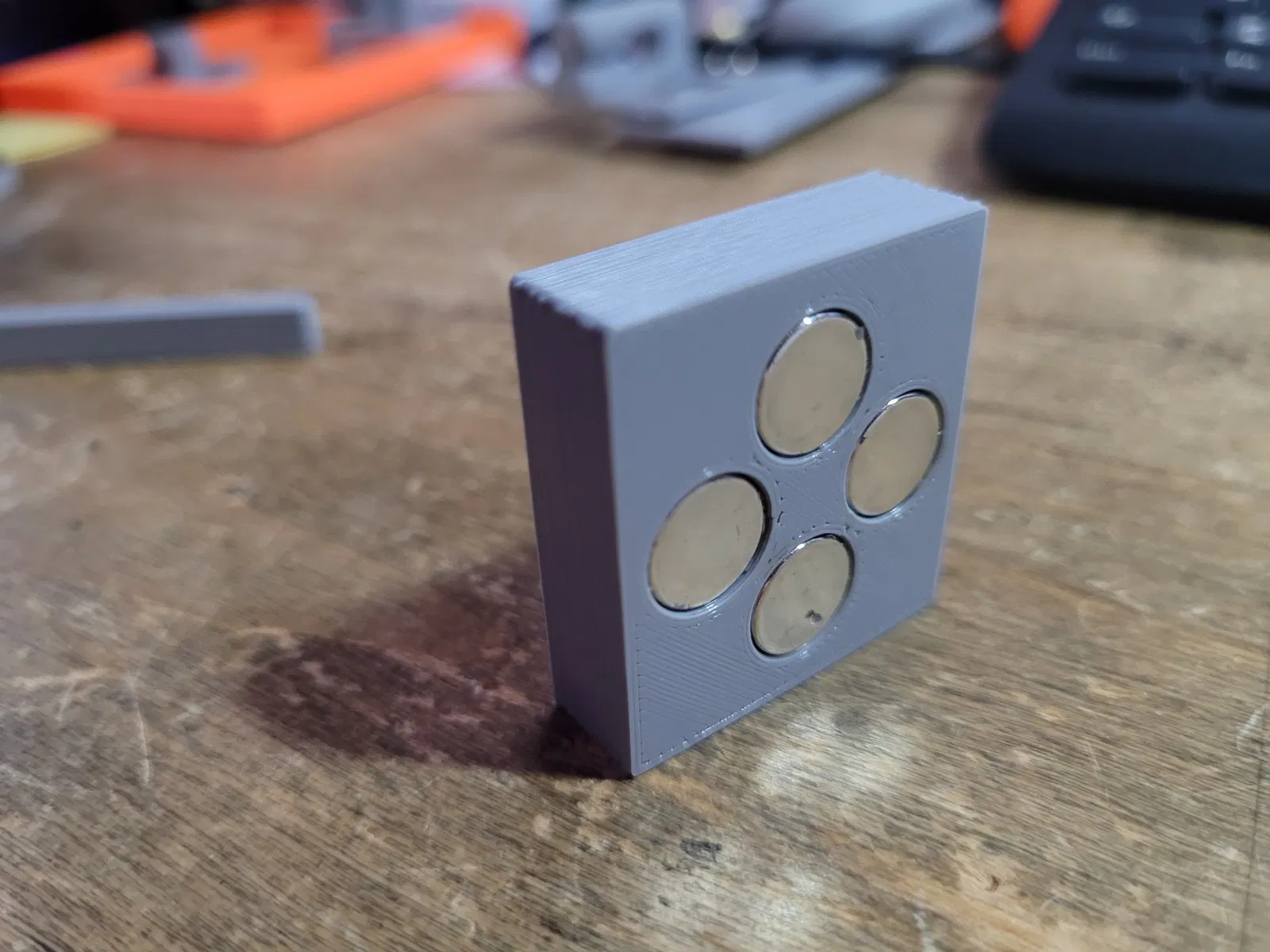 Rồi mình làm theo nguyên lý giá đỡ nam châm, nhét vừa một khối 8 viên nam châm kích cỡ 10mm x 5mm. (Bám chắc lắm nha!)