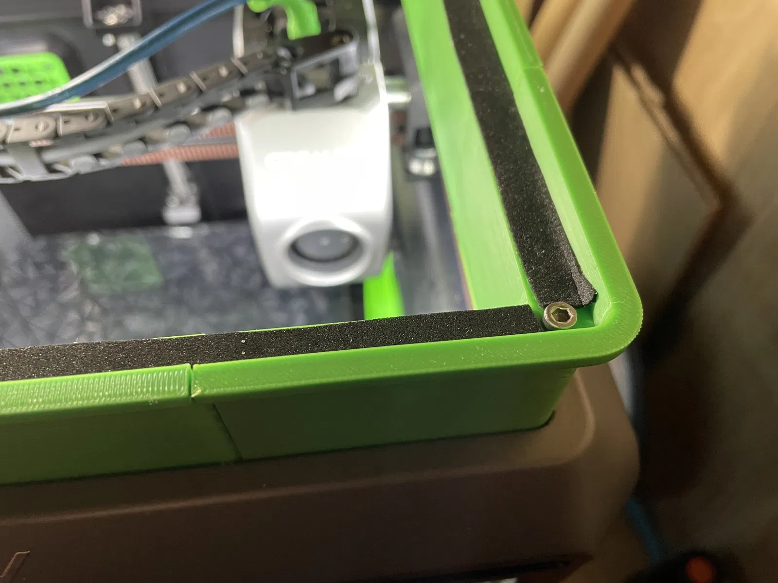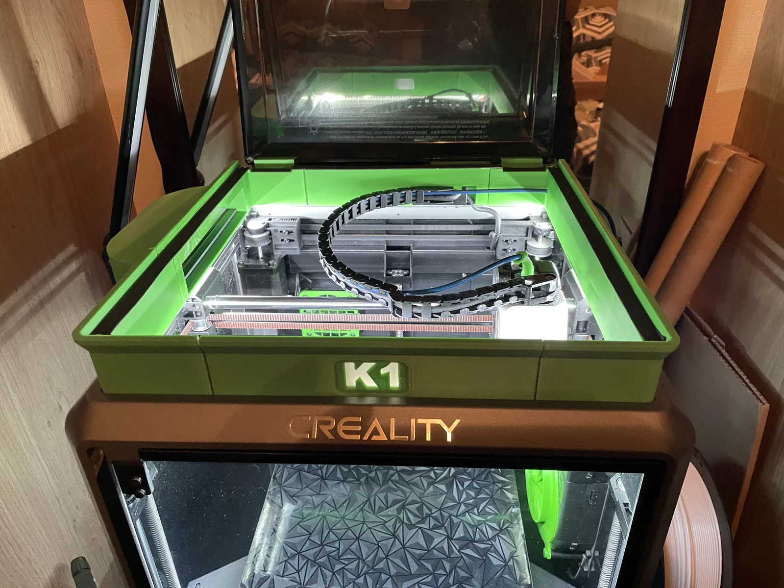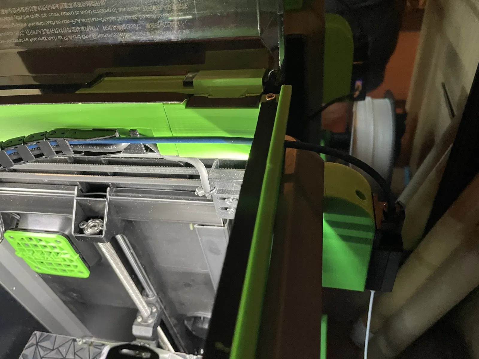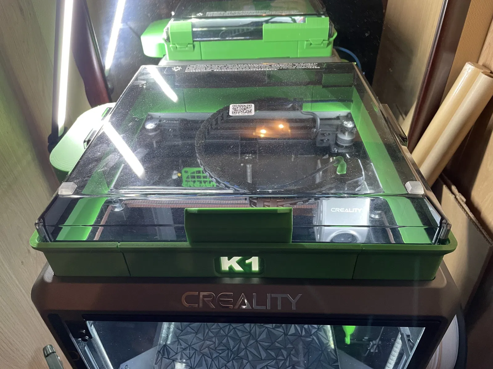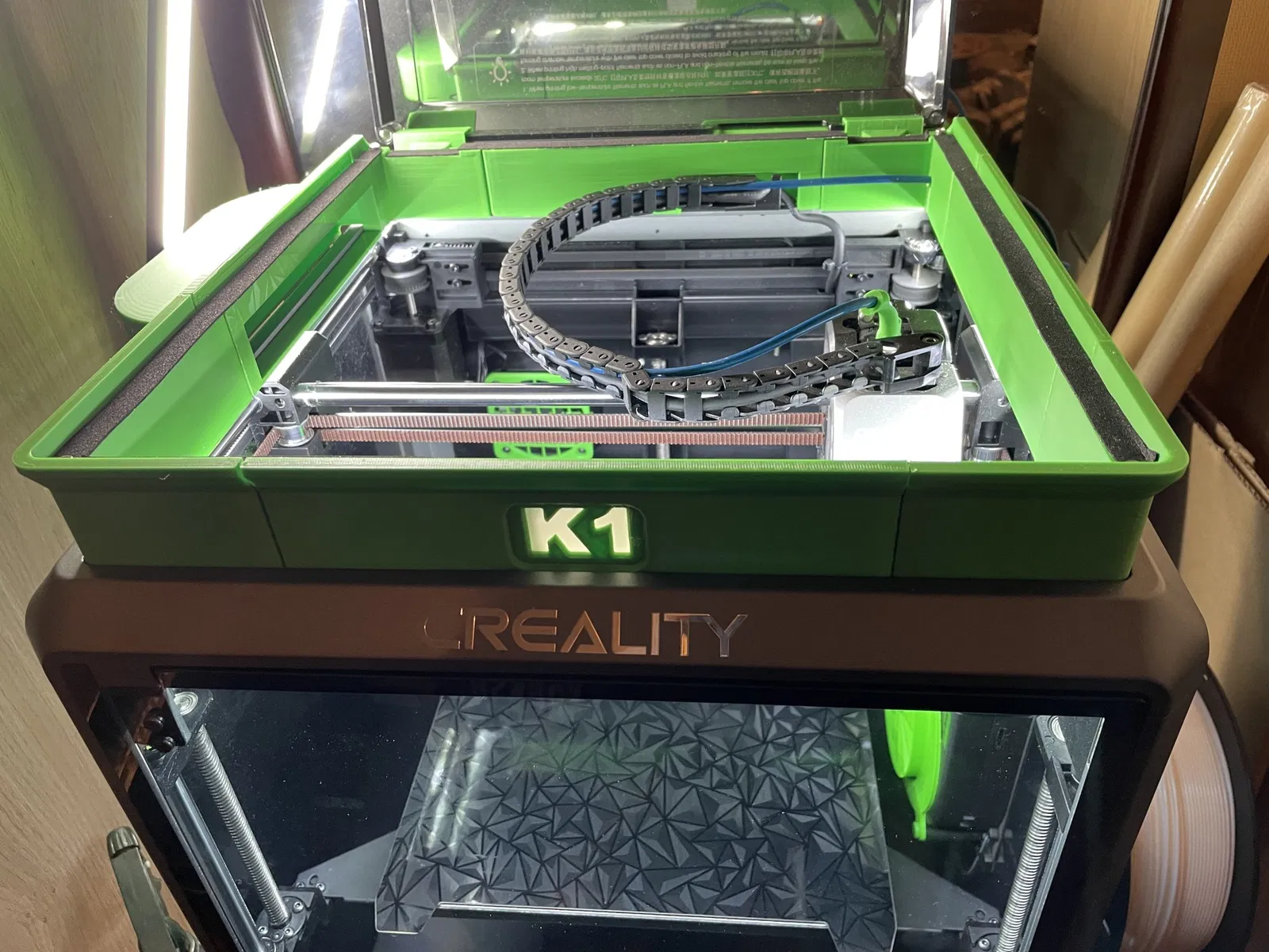 Giá đỡ nắp gập cho Creality K1, giúp giữ kín máy khi in ABS, ASA, v.v. Có tùy chọn cho Cảm biến Filament gắn bên hoặc gắn sau.