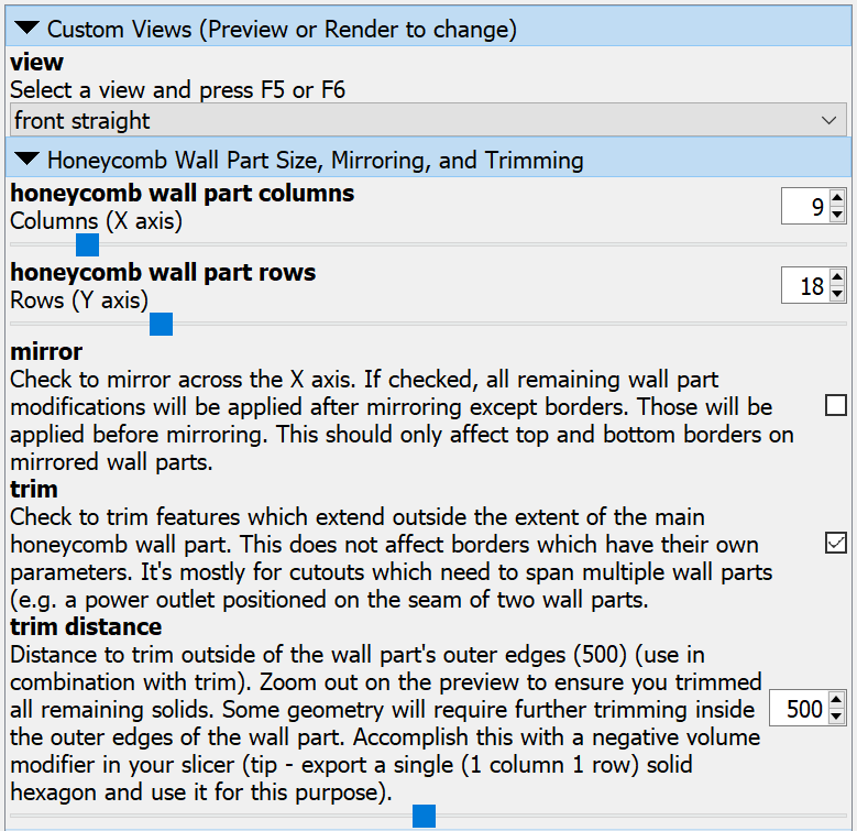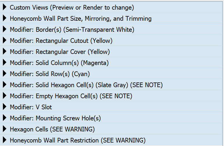 Động Lực Cuối cùng tôi cũng thiết kế và lắp đặt xong Tường Lưu Trữ Ong (Honeycomb Storage Wall) của mình. Thật không may, bộ phận tường đầu tiên tôi cần lại nằm ở dưới cùng (có viền) và tôi có một ổ cắm điện bắt đầu từ bộ phận tường này và kéo dài sang bộ phận liền kề. Tôi cần các tính năng từ mỗi mô hình được gán thuộc tính và một số chức năng ban đầu. ##### Tính Năng Mô hình này kết hợp các bộ sửa đổi hữu ích nhất (theo ý kiến của tôi) có sẵn trong mỗi mô hình, đồng thời cải thiện tính khả dụng và chức năng của chúng. Nó cũng bổ sung các tính năng bổ sung để hỗ trợ thêm cho bố cục của dự án Tường Lưu Trữ Ong. Bao gồm các tính năng sau: * Viền có thể kéo dài ra cạnh của mô hình hoặc giới hạn ở hình học của cạnh tương ứng và độ dày tường của viền có thể được chỉ định.