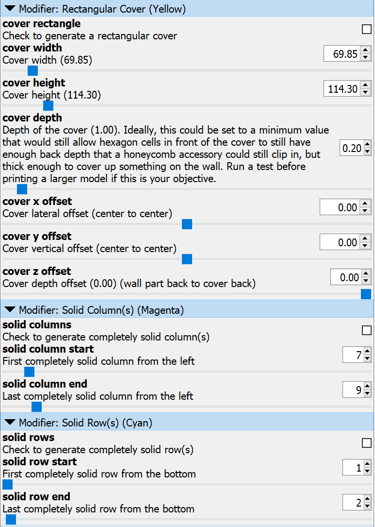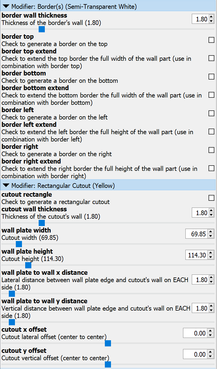 - Tổng thể Khớp với thông số kỹ thuật và kích thước HSW ban đầu. Định hướng đúng (x là ngang, y là dọc và z là độ sâu). Trình tùy chỉnh được mô tả đầy đủ và định dạng đúng. Màu sắc hỗ trợ nhập tham số bộ sửa đổi và cho biết định hướng đúng trong quá trình thiết kế và bố trí (ví dụ: mặt nào là mặt trước và mặt nào là mặt trên khi lắp đặt). Chế độ xem tùy chỉnh để hỗ trợ định hướng đúng trong quá trình thiết kế và bố trí. Các tham số và kích thước đầu ra bảng điều khiển hỗ trợ bố trí tính năng (ví dụ: vết cắt ổ cắm). (Hầu hết) Các tham số ô hình lục giác có sẵn trong Trình tùy chỉnh để xác nhận/điều chỉnh nhỏ so với kích thước thông số kỹ thuật HSW. HÃY CẨN THẬN KHI SỬ DỤNG! ##### Tính Năng Mới trong v1.1 Nắp Chữ Nhật - Thêm một khối hình chữ nhật vào mặt sau (mặc định) để che vật gì đó trên tường (ví dụ: hộp điện áp thấp, vết bẩn, v.v.).