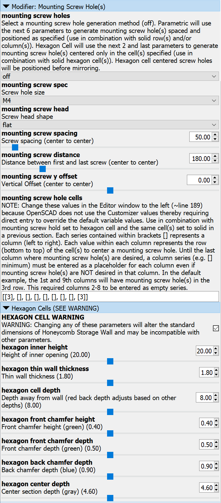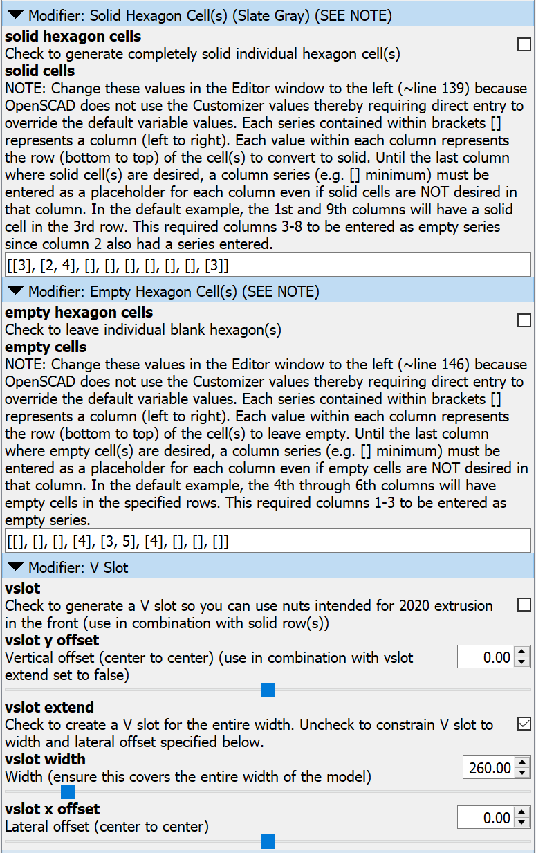 - Lỗ Vít Căn Giữa Ô Hình Lục Giác - Lỗ vít được căn giữa trong các ô hình lục giác riêng lẻ. ##### Hướng Dẫn Hướng dẫn sử dụng mô hình này có sẵn ở đầu cửa sổ Trình chỉnh sửa trong tệp .scad. Nếu bạn chưa bao giờ sử dụng OpenSCAD trước đây, đây là cách bắt đầu: 1. Tải xuống và cài đặt OpenSCAD. * https://openscad.org/downloads.html