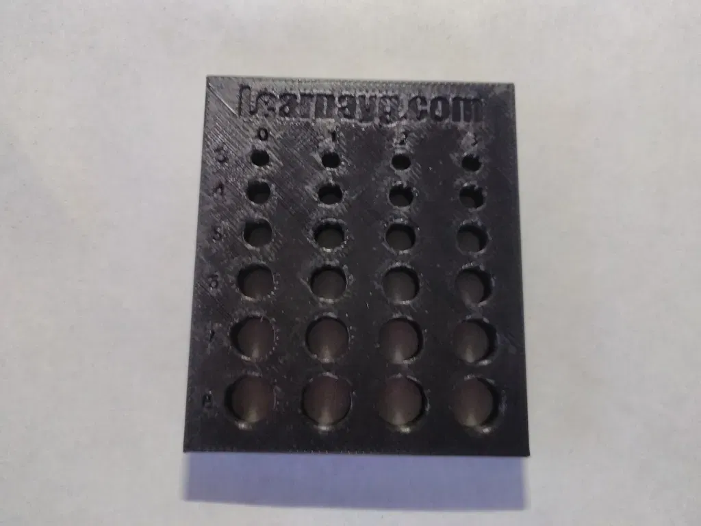 Đây là một dụng cụ đo dung sai để xác định kích thước lỗ trong các bản in 3D. Kích thước lỗ là từ 3mm đến 8mm, với mỗi cột được cộng thêm 0.0mm đến 0.3mm. Dụng cụ này được sử dụng bằng cách đặt một con vít hoặc vật thể khác vào một trong các lỗ để xem lỗ nào có độ khít tốt nhất.