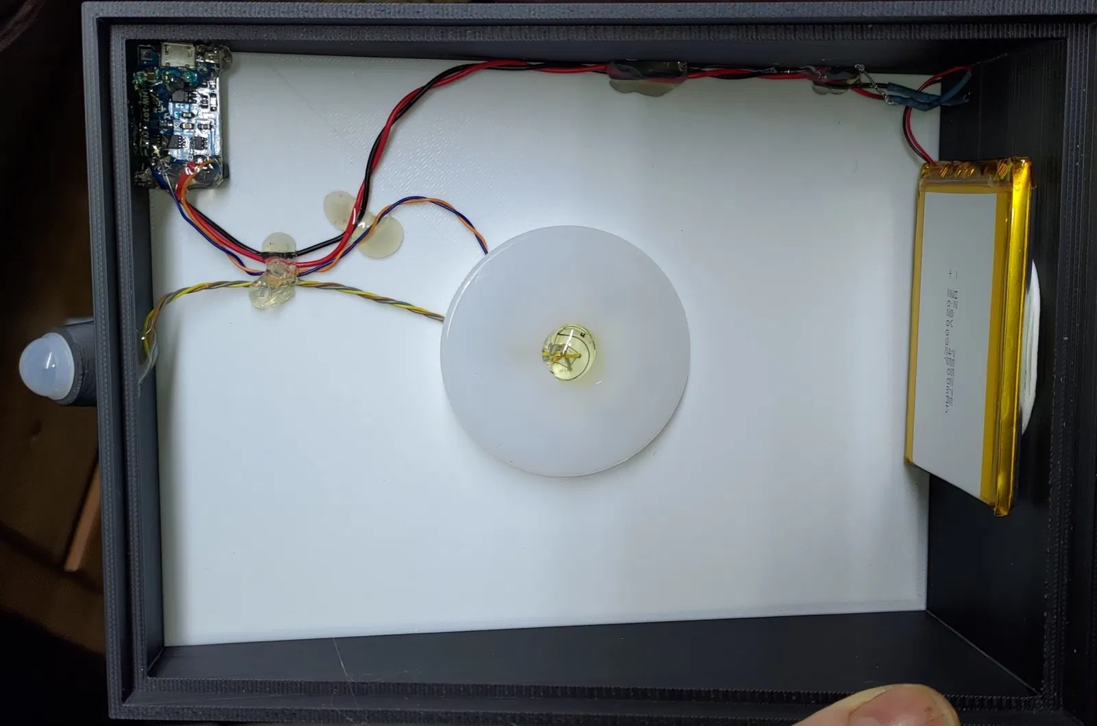 Bước # 9. Lấy ống kính đã được giữ với lỗ ở giữa, và áp dụng nó vào nơi cảm biến đã từng ở trên lớp keo sau đó thêm nhiều keo hơn để dán ống kính xuống như trong hình. Điều này hoàn thành hộp litho và đèn LED sẽ hoạt động khi cảm biến được kích hoạt trong điều kiện ánh sáng thấp. Ngoài ra, đèn sạc sẽ hoạt động khi bạn cắm cáp sạc USB.