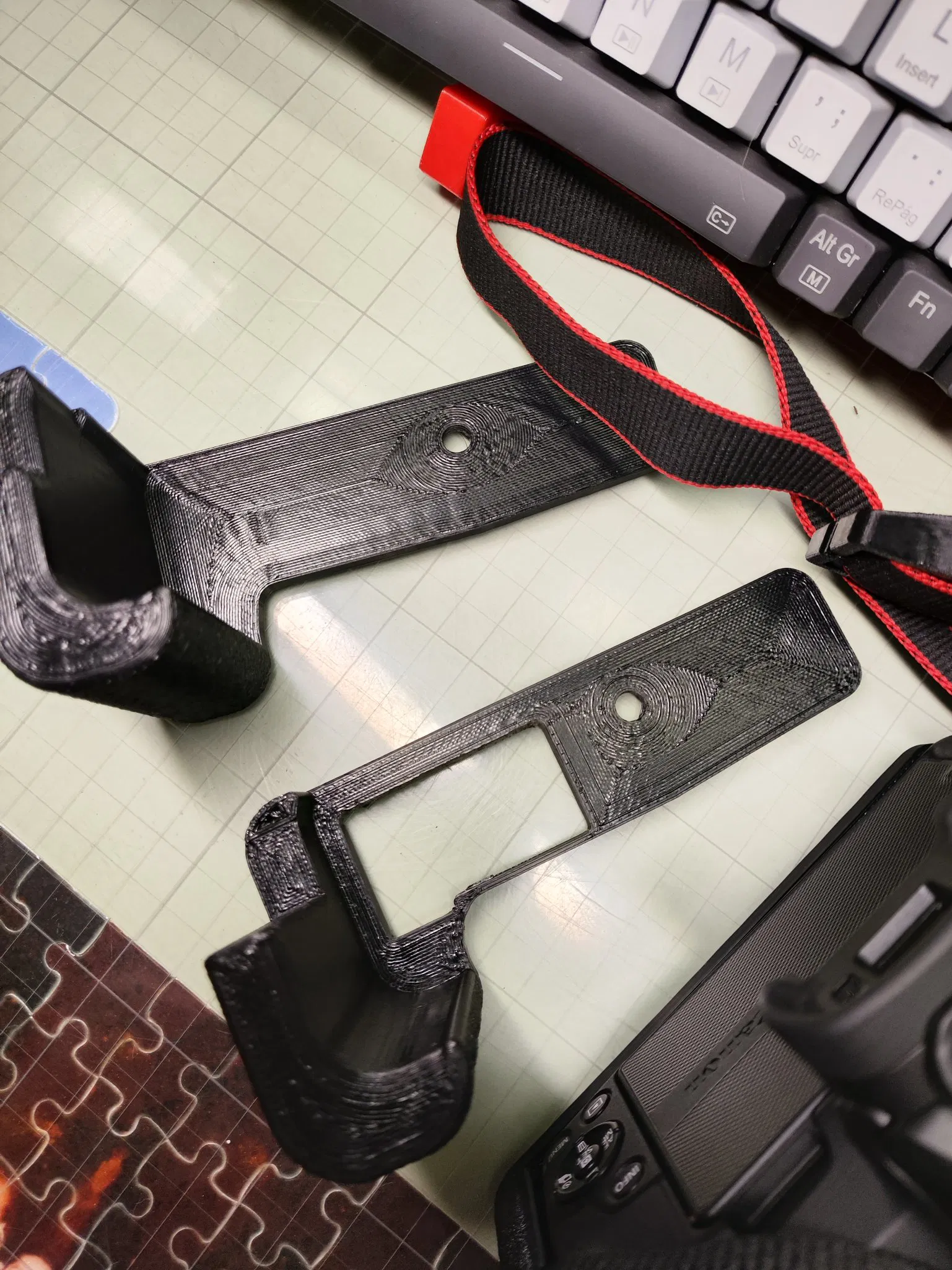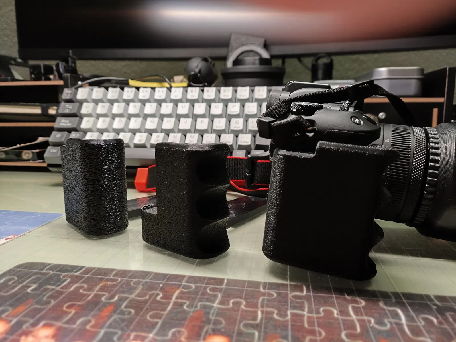 Đây là một bản remix tay cầm cho Canon R50/R100 từ MakerWorld (mô hình gốc ở bên trái). Tôi thực sự thích thiết kế gốc nhưng tôi thấy việc tháo tay cầm để sạc máy ảnh qua cổng USB hoặc pin hơi phiền phức, vì vậy tôi đã quyết định tạo một lỗ cho khoang pin & SD để tay cầm không cần phải tháo ra.
