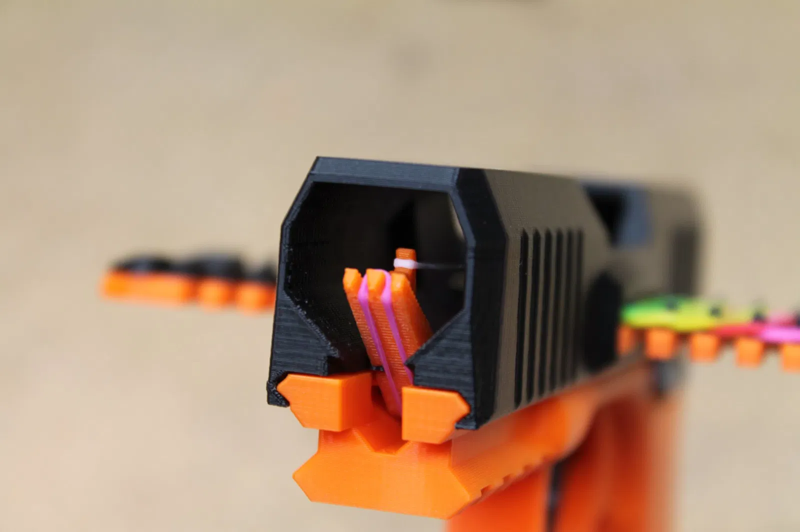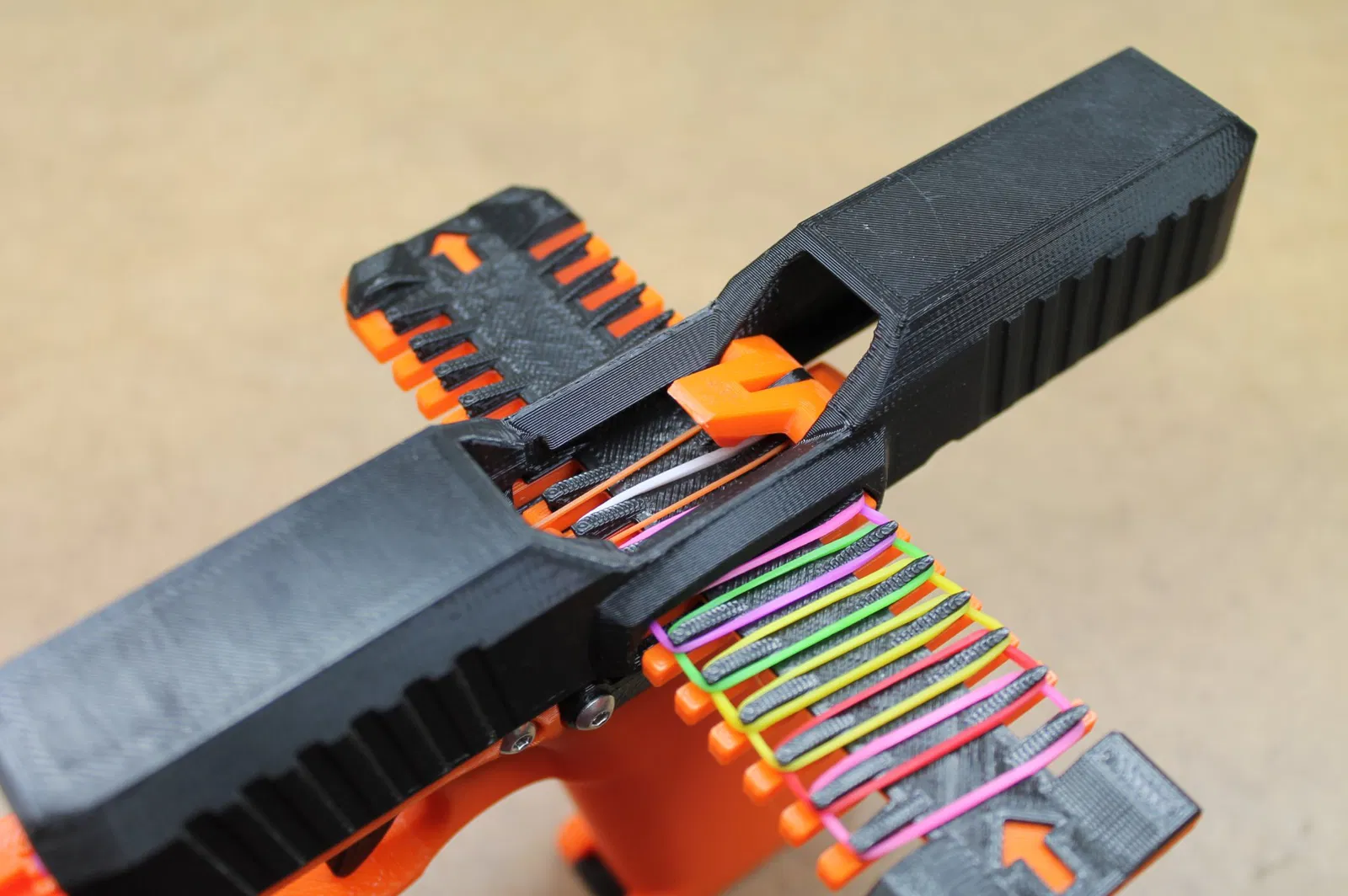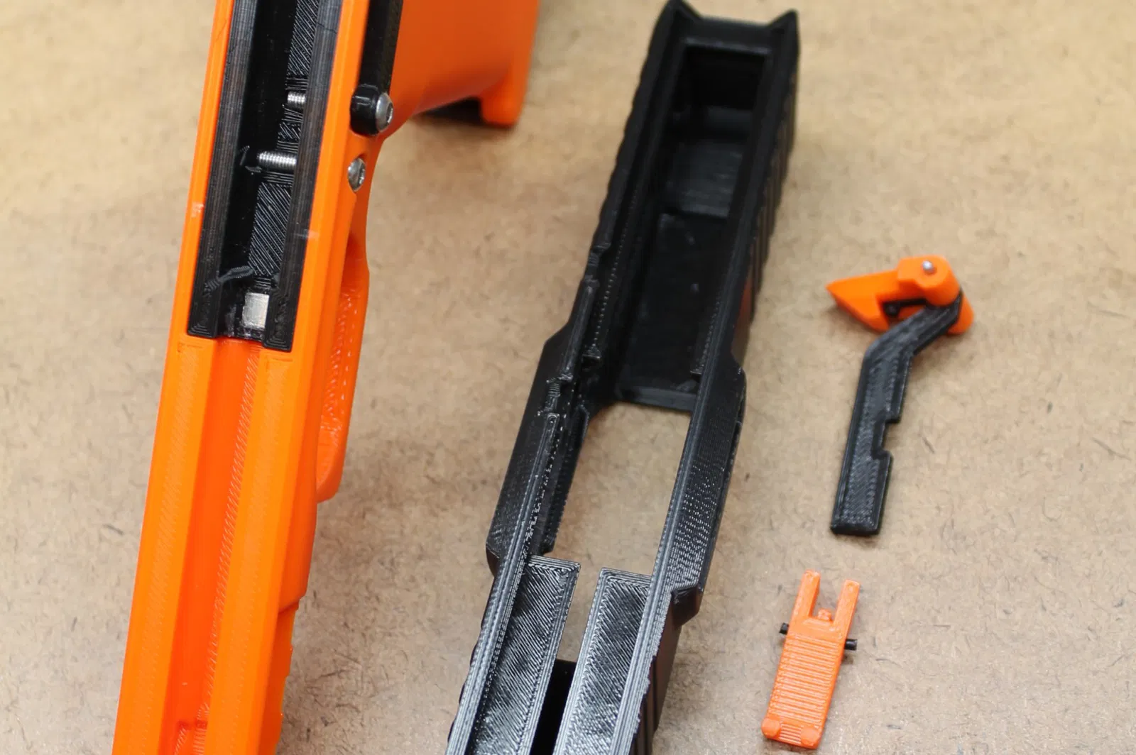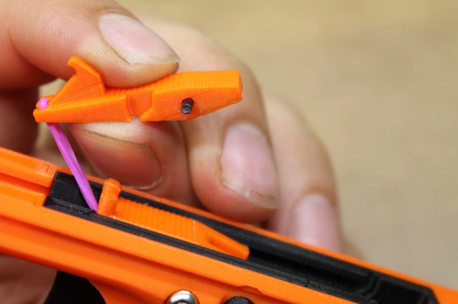 Điều duy nhất đã thay đổi cho việc lắp ráp là lò xo trả cò (lò xo ngắn) bây giờ nằm giữa Cò và Chèn (trên cùng của Cò), thay vì giữa Tay cầm và Cò (dưới Cò). Tôi cũng khuyên bạn nên sử dụng kim loại cho chốt móc sau thay vì filament. Nó sẽ không bị mòn nhanh như vậy, tôi sử dụng dây treo áo. Lò xo tôi sử dụng (cắt theo chiều dài). https://www.mcmaster.com/9657K693/ Nam châm tôi sử dụng. https://www.indigoinstruments.com/magnets/rare_earth/blocks/rare-earth-square-magnet-5x5x2.5mm-44222-2.5.html#8773