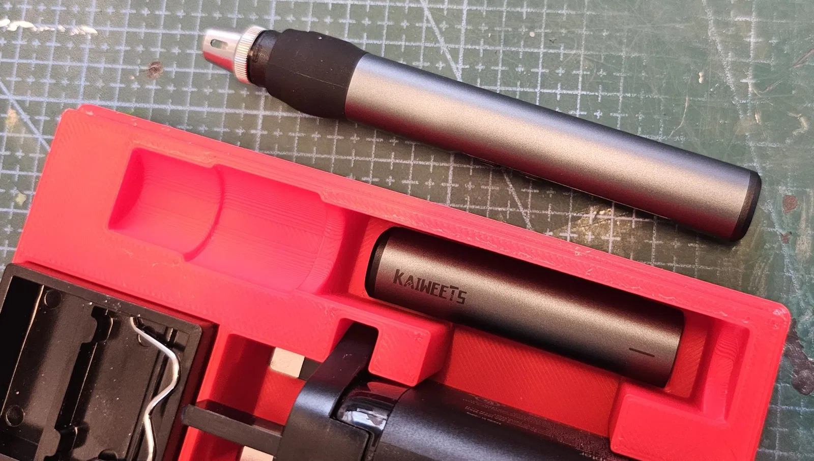 Để giữ cho nó gọn gàng, nắp được đặt vào một không gian dưới bút. Các đầu hàn có giá đỡ riêng có thể được đặt dưới cáp USB. Các đầu hàn được thả ra bằng cách ấn phần trước xuống. Phần sau sau đó nâng lên.
