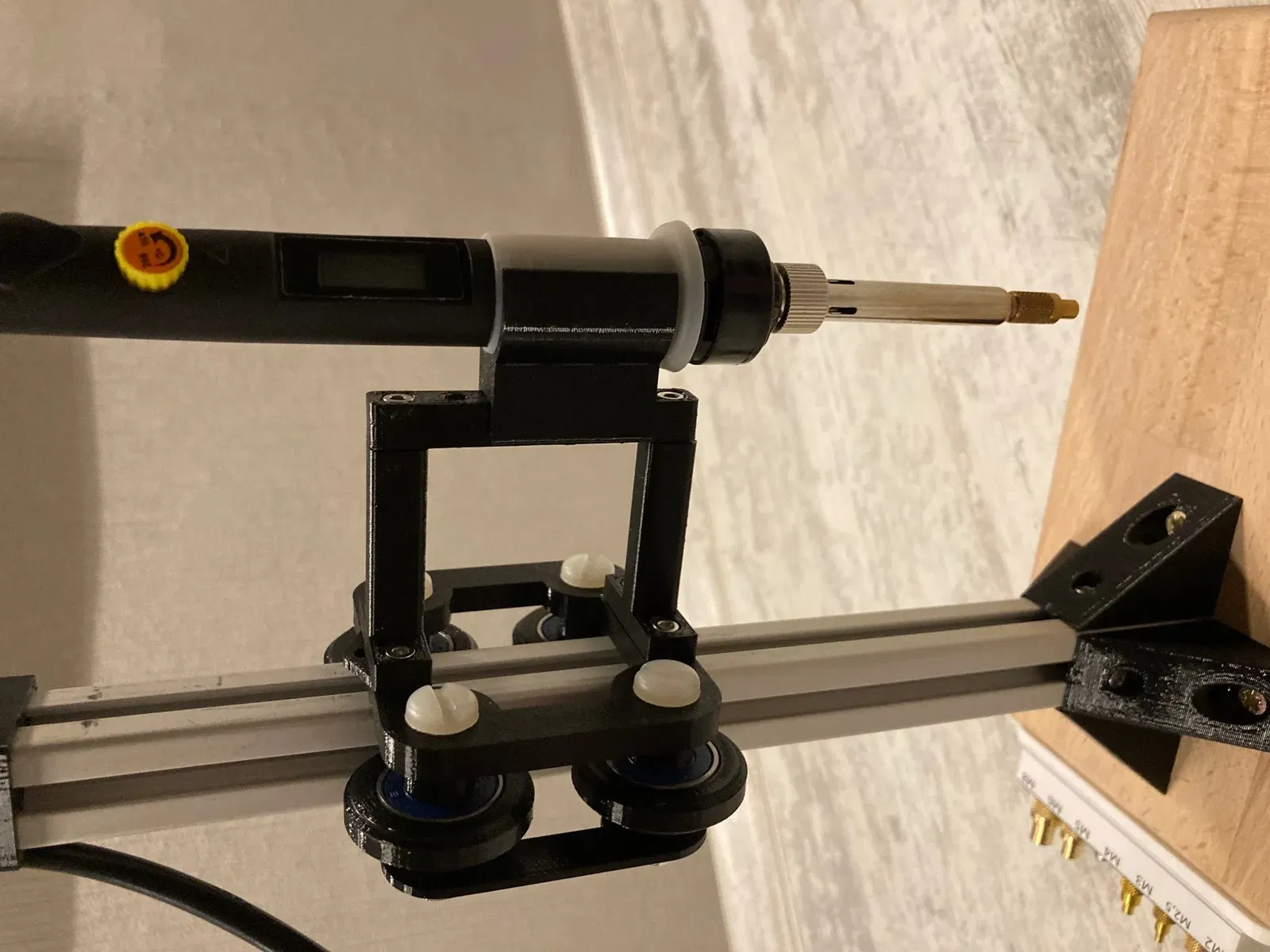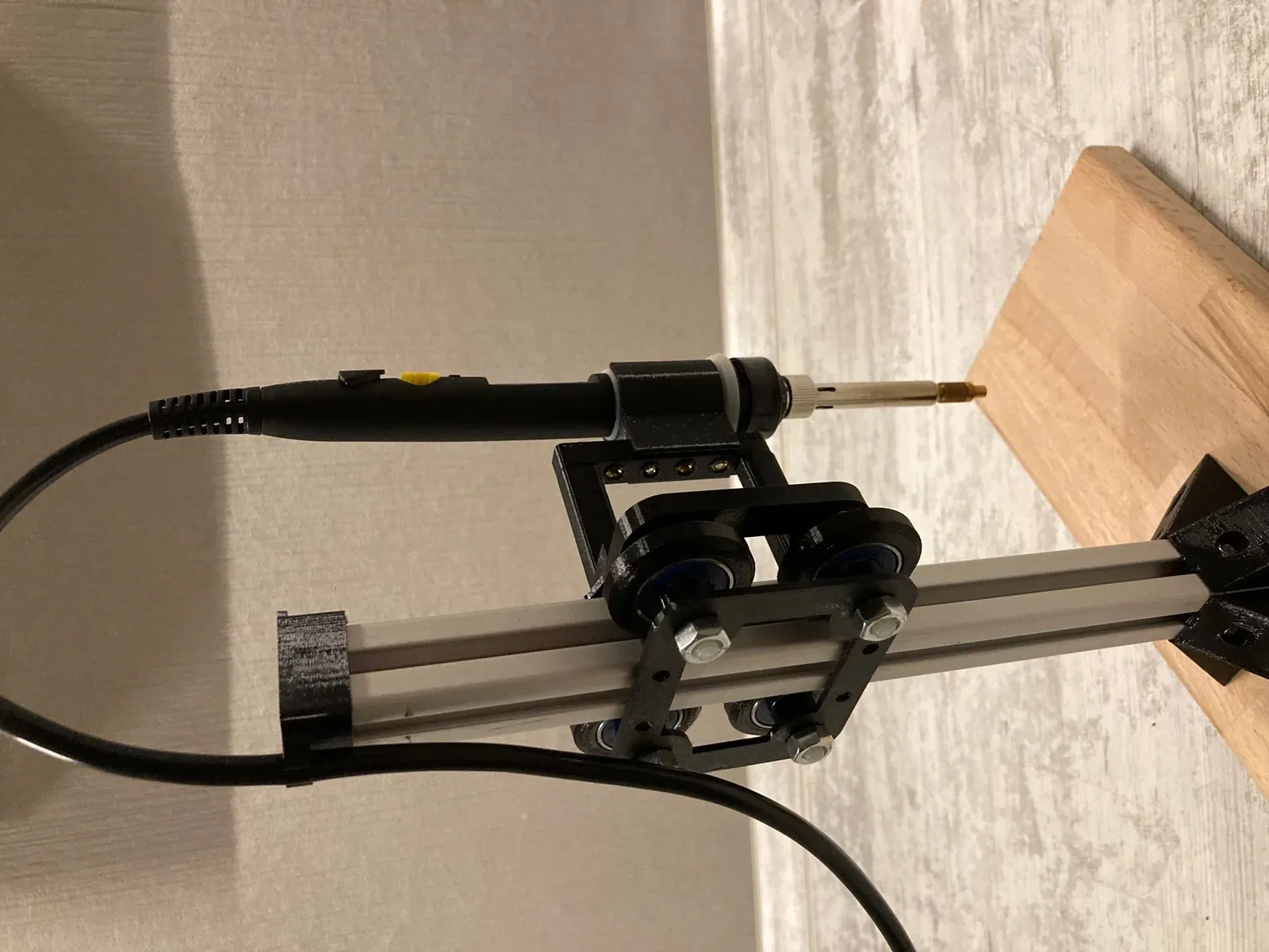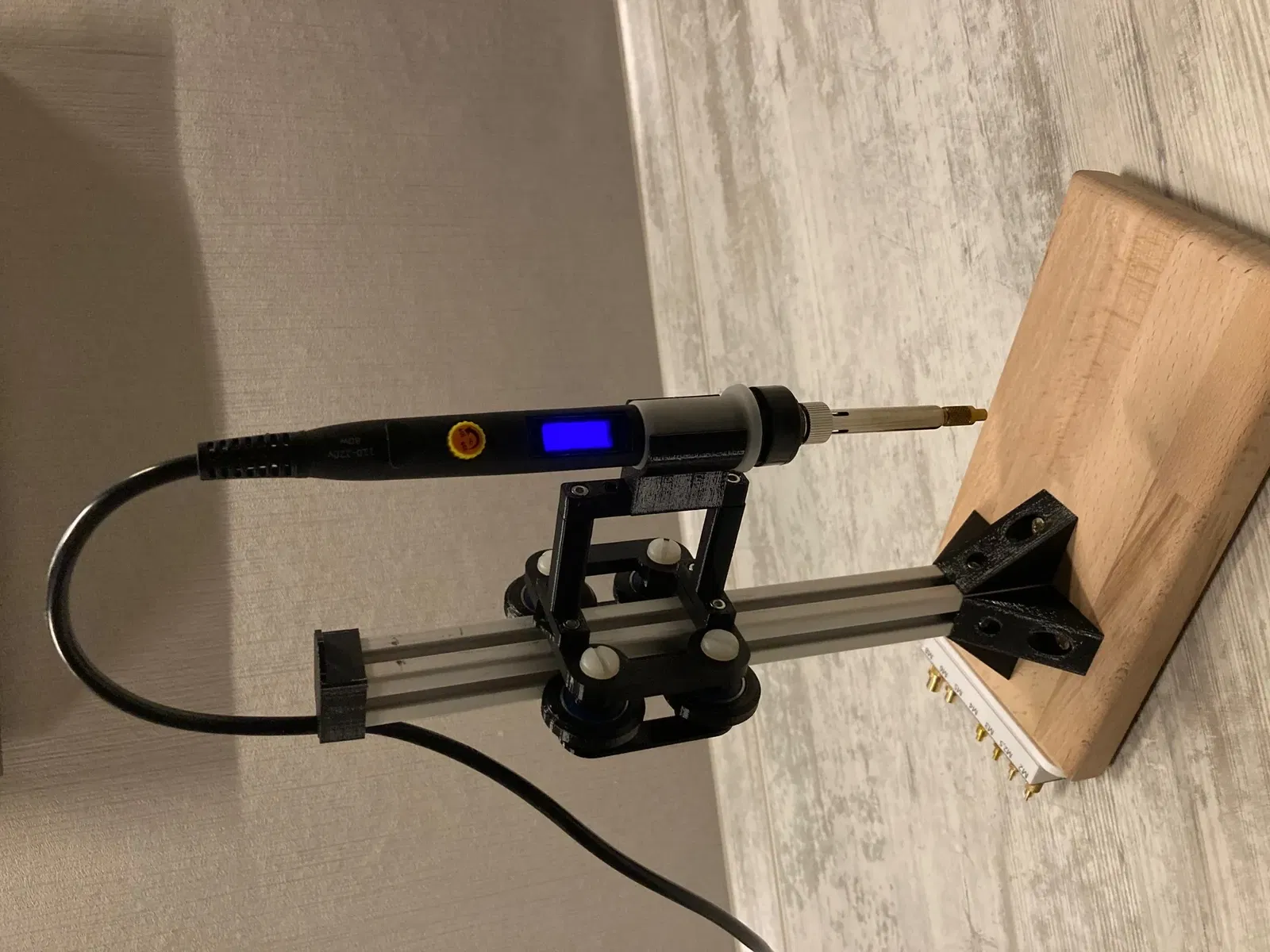 Einfache Einschmelzhilfe aus 2020 Aluprofil und Lötkolben mit Ruthex Lötspitzen für gerade sitzende Gewindeeinsätze.