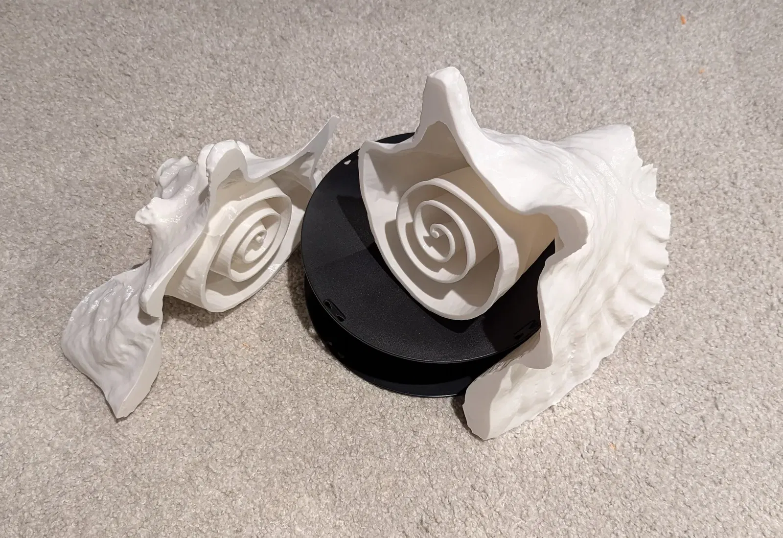 Chiếc kèn ốc xà cừ này được làm từ vỏ ốc xà cừ scan 3D, có thêm xoắn ốc và loa kèn trumpet để âm thanh nghe giống thật. Chia làm 2 mảnh, in vừa khay Ender 3.