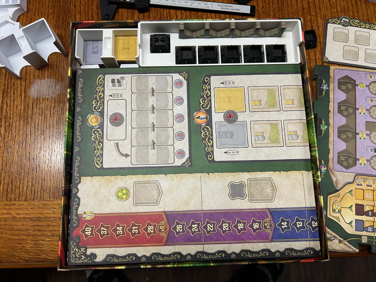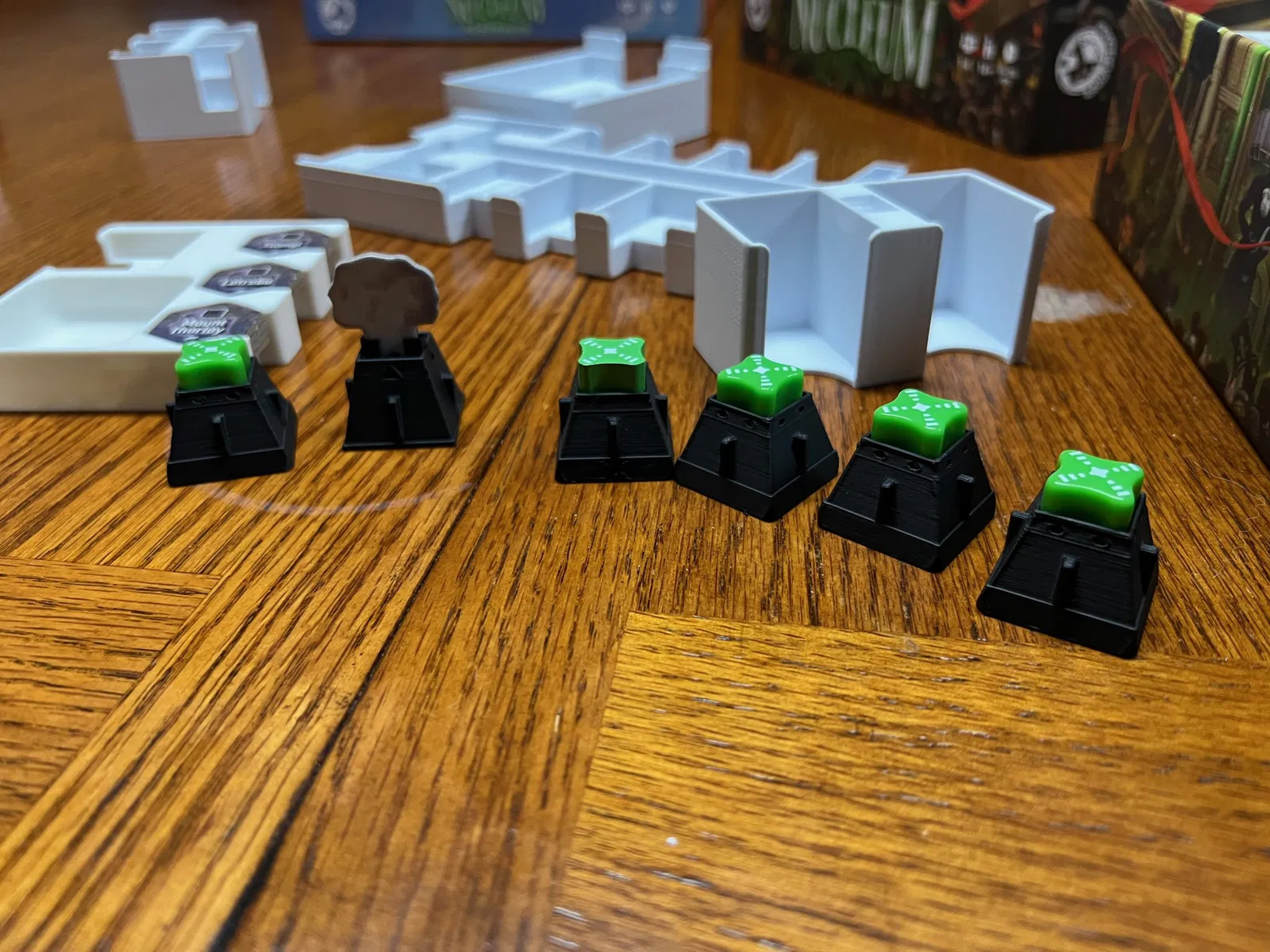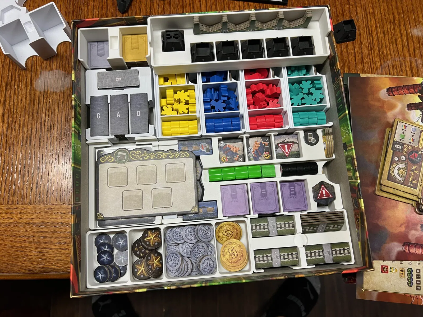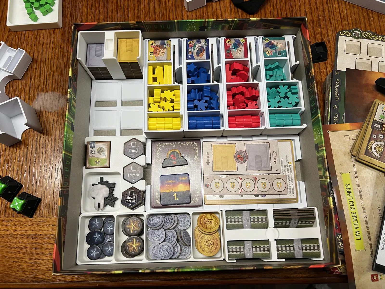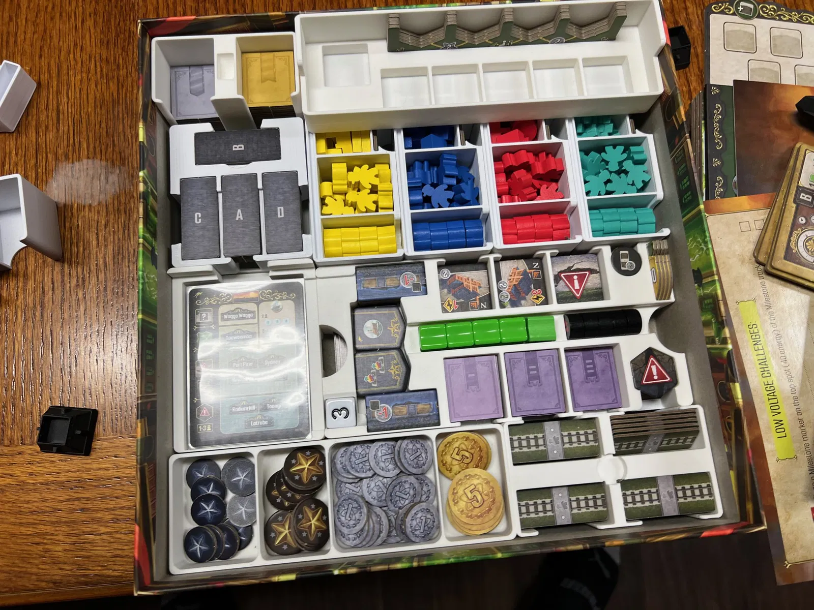 Các loại thẻ khác có thể được bọc, mặc dù tôi không chơi solo và chưa bọc các thẻ solo. Tôi đặt các token người chơi đầu tiên và token VP của mình ở đó bây giờ, vì bộ giữ ô hành động ban đầu cần chỗ cho một ô hành động bổ sung (hành động Thuyền từ Úc).