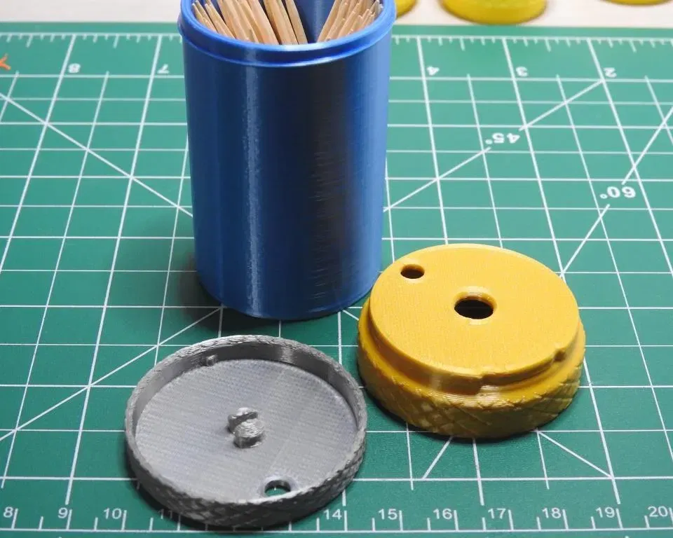 Hộp nhả tăm dễ in, dễ sử dụng, có thể tùy chỉnh. Nắp vặn xoay dễ dàng cho tăm vào, chỉ cần xoay để mở lỗ nhả tăm. Có thể in không cần hỗ trợ và tùy chỉnh kích thước trong Fusion 360.