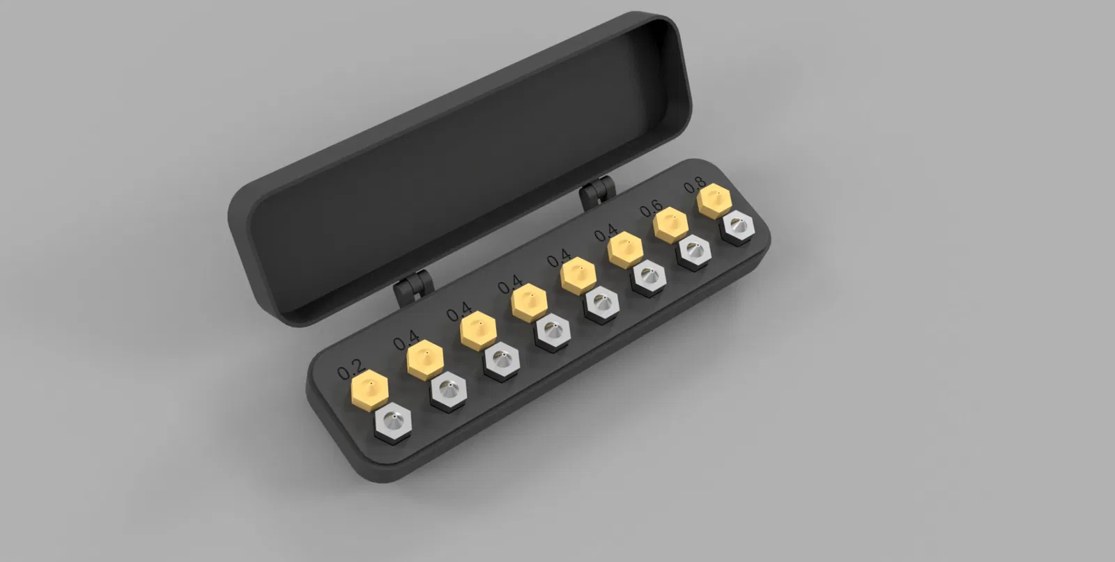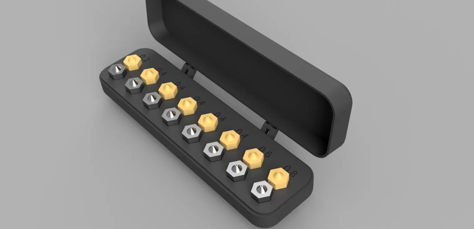 Mẫu hộp đựng đầu phun "print in place" đơn giản này, thiết kế vừa vặn cho các loại đầu phun E3D v6 (như đầu phun ruthex). Thích hợp cho ai muốn giữ gìn đầu phun gọn gàng và dễ lấy.