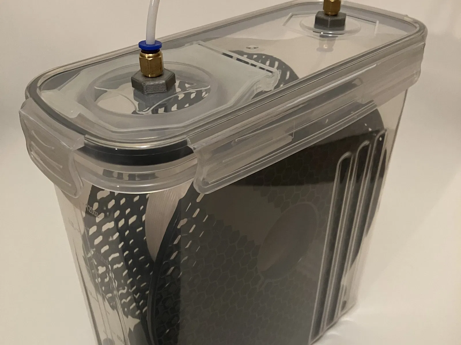 Do mẫu gốc không vừa với máy Prusa Mini của tui, nên tui đã cắt bớt một đầu và chỉnh sửa để gắn vừa cái hygrometer loại rẻ hơn một chút. Bạn vẫn có thể thêm chất hút ẩm (desiccant) vào khay để làm một cái hộp chống ẩm (dry box) đúng nghĩa, nhưng tui khuyên bạn nên bỏ vào hộp lắc inox để có thể dễ dàng làm khô hơi ẩm trong lò nướng định kỳ. Mẫu này cần vòng bi 608 (608 bearings).