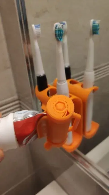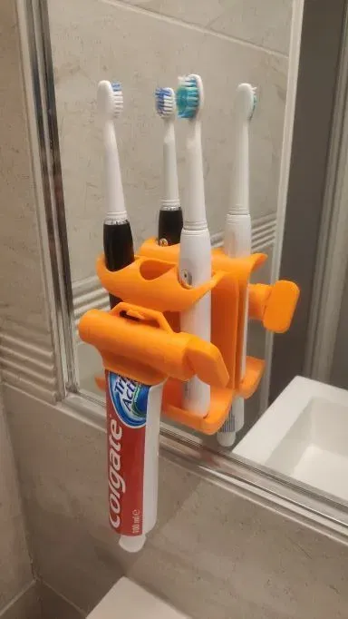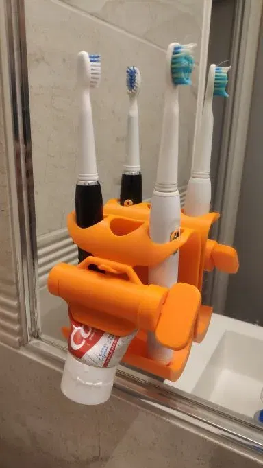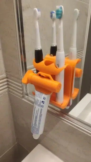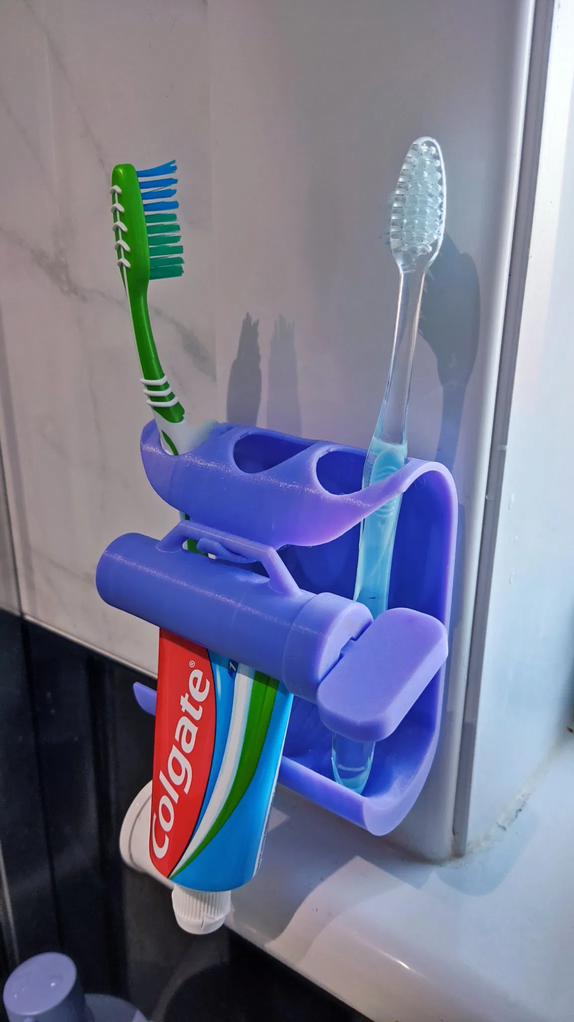 Bộ sản phẩm nhỏ gọn tích hợp dụng cụ nặn kem đánh răng và giá đỡ bàn chải, dễ dàng gắn tường/gương. Phiên bản cập nhật cho 2, 3, 4 bàn chải, có cả loại thẳng dễ in hơn. In không cần support. Hỗ trợ tác giả qua Ko-fi.