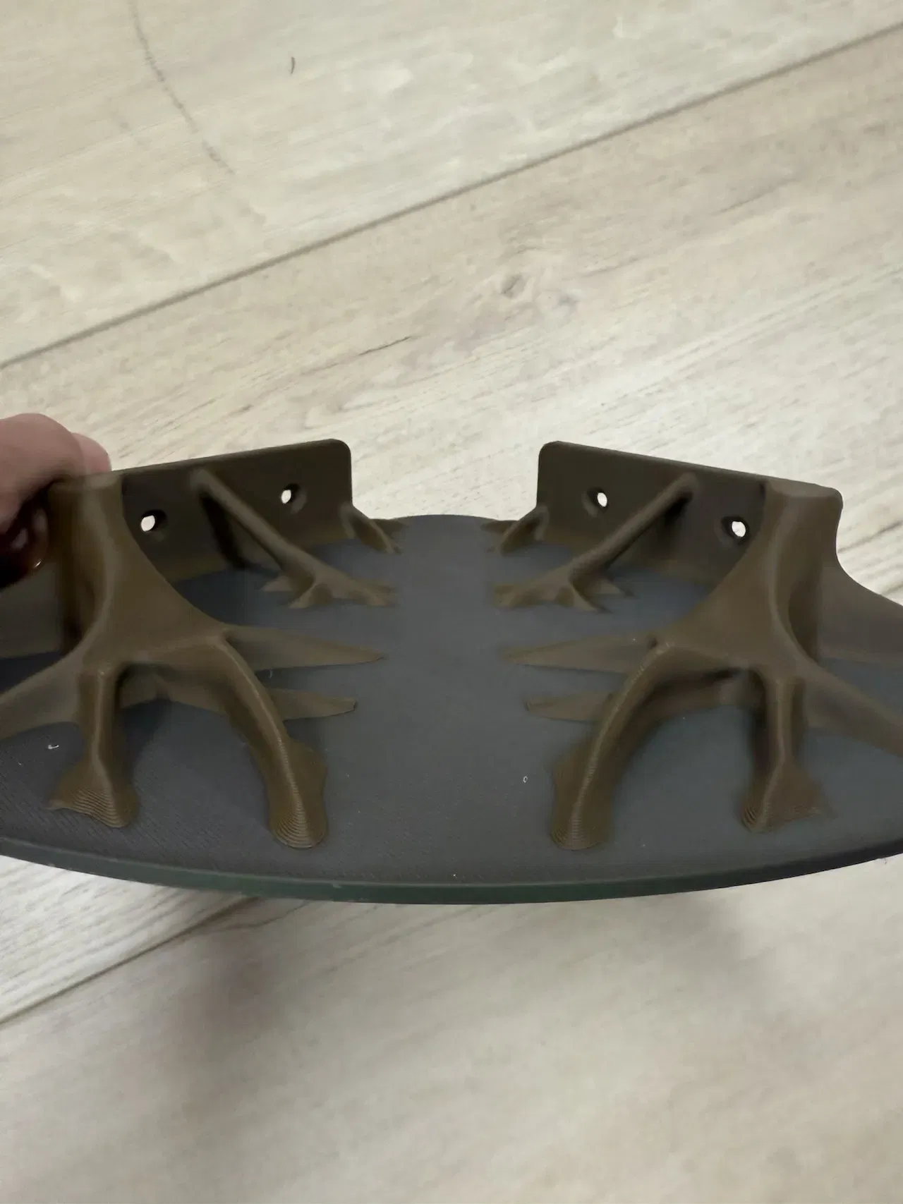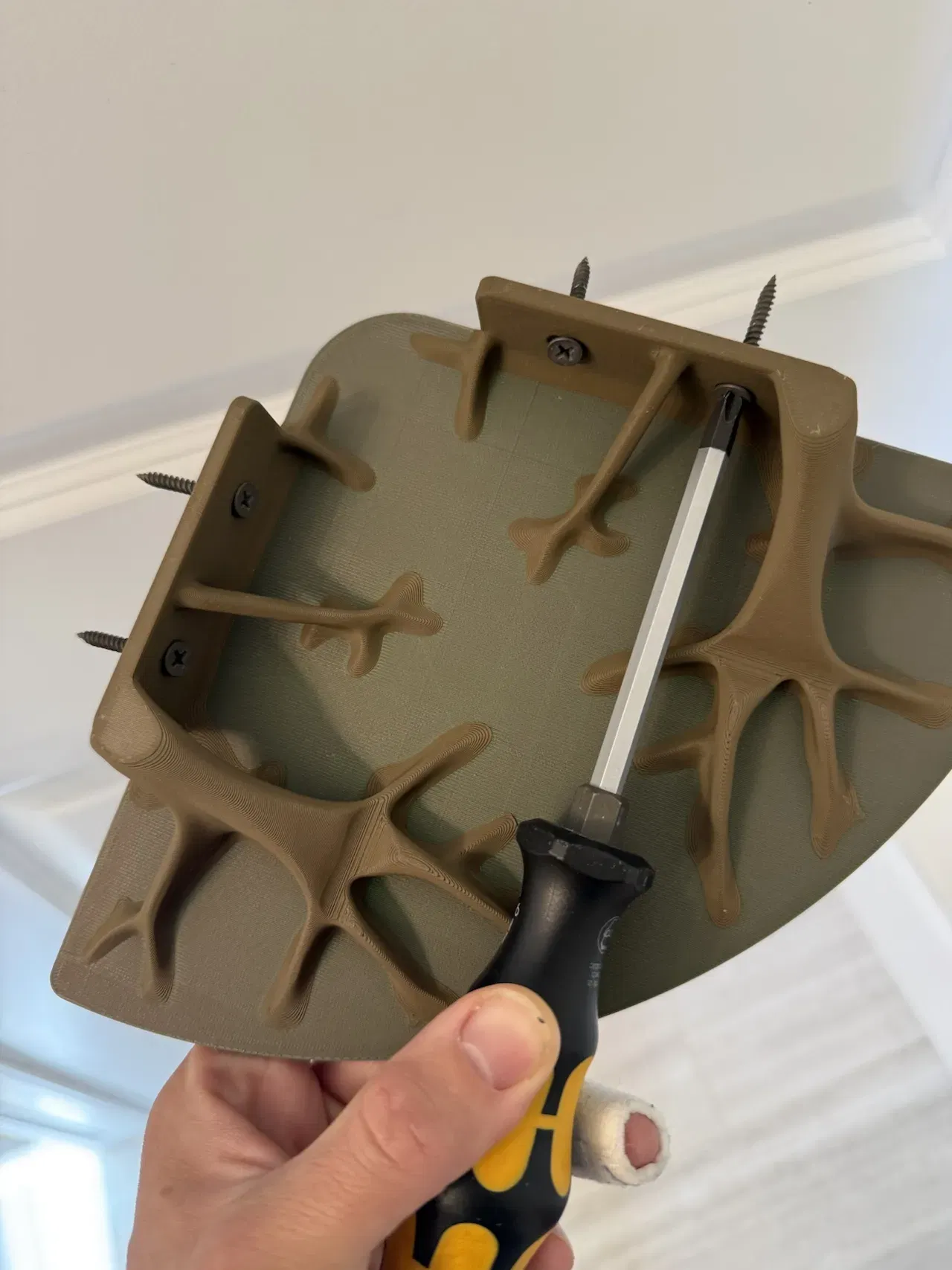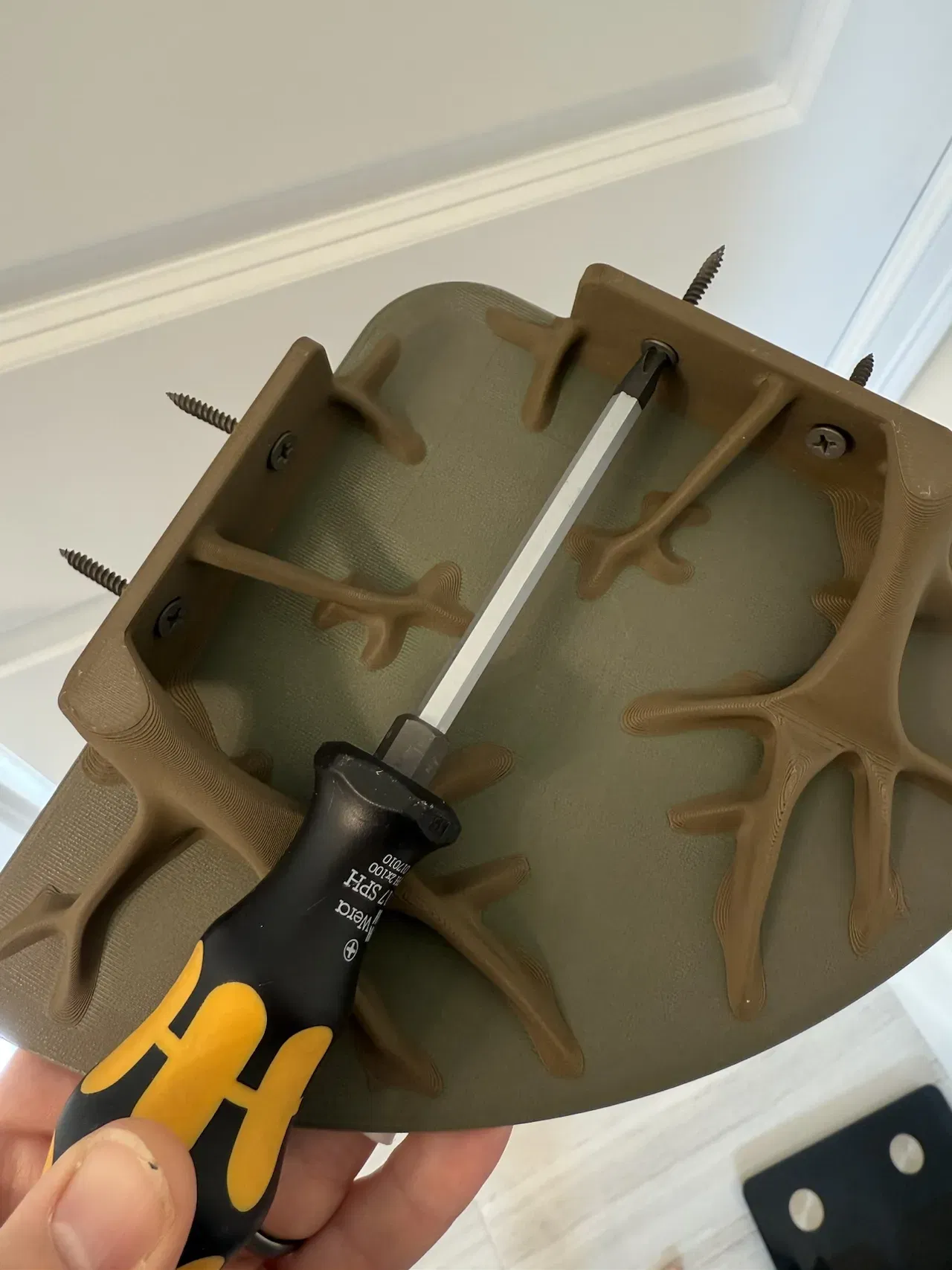 Chiếc kệ này được thiết kế để gắn bằng ốc vít, và có các lỗ trên phần đỡ hình cành cây được thiết kế để chịu tải hiệu quả. Đảm bảo bạn bắt vít vào thanh giằng tường, hoặc sử dụng các loại nở (anchors) phù hợp cho thạch cao trên bề mặt của bạn. Hình dạng cành cây được tối ưu hóa có một chút khác biệt so với phiên bản dùng keo dán mà tôi đã thiết kế ở đây để tạo không gian và độ bền cho đầu ốc vít.