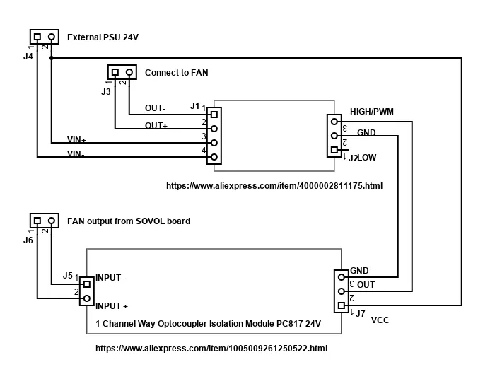 LƯU Ý QUAN TRỌNG: Hãy chú ý đến dòng điện tiêu thụ. Mình đã thử nghiệm với tổng dòng điện 0.5A và hoạt động ổn, nhưng khi mình lắp hai quạt 18W (tổng dòng điện 1.52A) thì đầu ra bị hỏng. Không rõ là do cầu chì bị cháy hay fet bị hỏng, mình sẽ kiểm tra và sửa sau. Do đó, việc sử dụng quạt công suất cao ở đây có thể sẽ cần SSR và nguồn điện ngoài.
