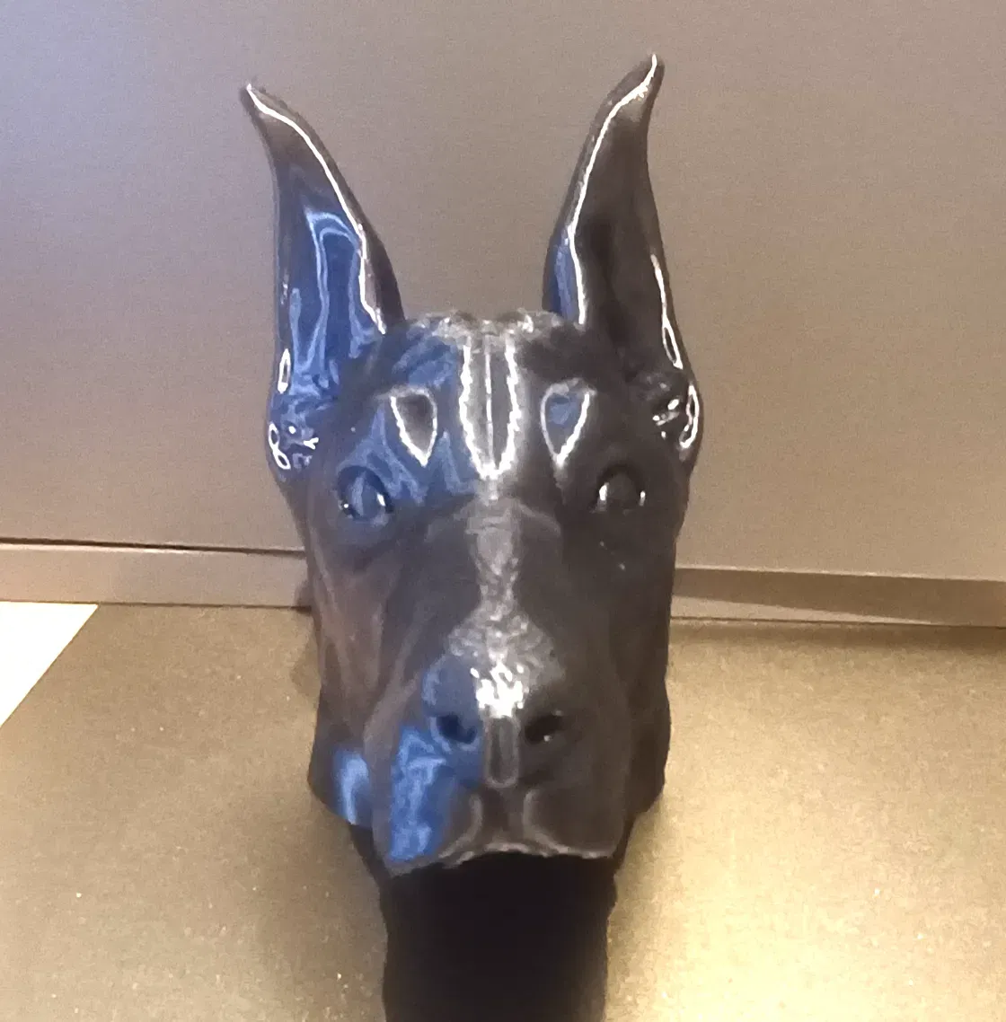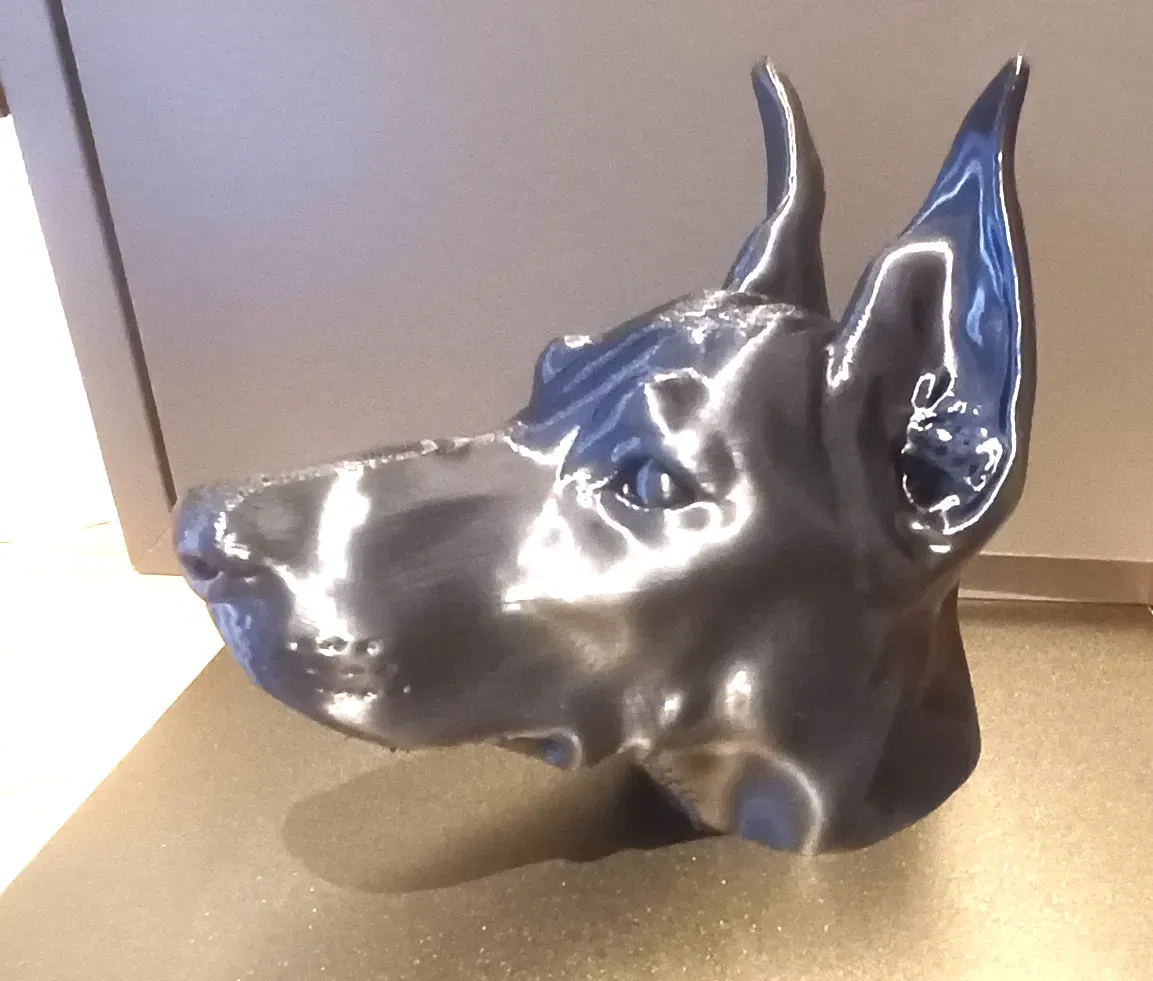 Mô hình mô tả đầu của một chú Dobermann với những đường nét rõ ràng, góc cạnh, rất lý tưởng cho những người yêu chó hoặc làm một tuyên bố nổi bật cho những người yêu động vật.