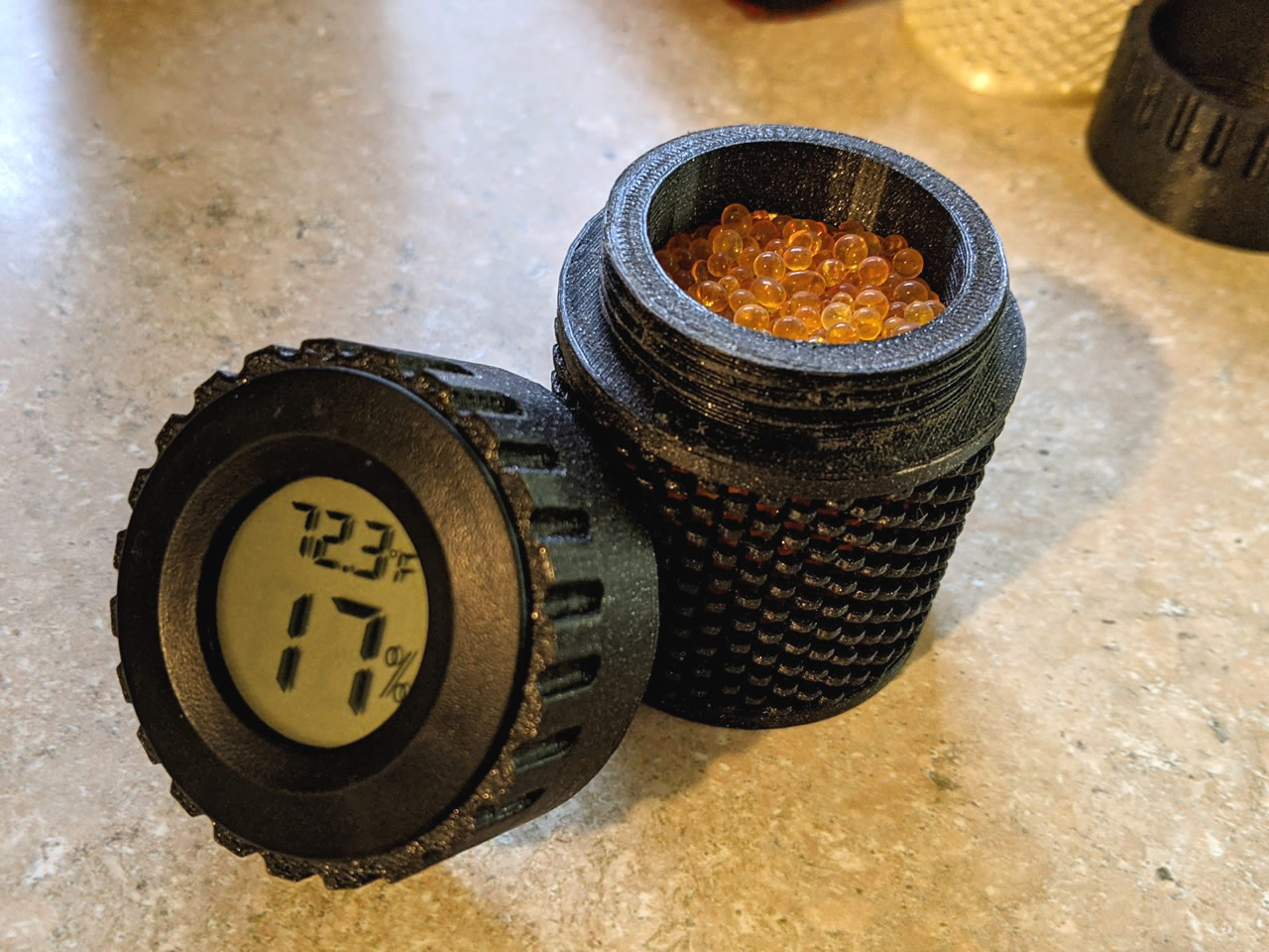Không chỉ in nhanh gần gấp 2 lần mà giỏ thu được còn chứa được hạt gel nhỏ hơn mà không cản trở luồng không khí. Với thiết kế này, bạn có thể in giỏ lớn có nắp trong khoảng 2 giờ 40 phút và chỉ hộp nhỏ có đồng hồ đo độ ẩm trong 2 giờ 20 phút. Hoặc in một bộ đầy đủ cả hai kích cỡ hộp trong 5 giờ hoặc ít hơn. Đó là với lớp cao 0.2mm, 15% infill, không support, 2 lớp tường, không ironing ở tốc độ khá thận trọng... rất muốn biết những người khác có thể in nhanh như thế nào. Tôi đã in các bộ bằng cả PLA và PETG với thành công lớn. Vui lòng xem thông tin bổ sung bên dưới về vị trí đường z-seam và cài đặt slicer. Và cho tôi biết trong phần bình luận về cách nó hoạt động với bạn... chúc bạn in vui vẻ. :) ### Màn hình Kỹ thuật số LCD Đo Nhiệt Độ Ẩm Kế… Có thể mua trên Amazon với giá rất hợp lý: https://amzn.to/3PWuEcZ (liên kết liên kết) Họ cũng đã đưa ra một phiên bản của hygrometer này sử dụng đầu dò từ xa với dây dẫn dài (1.5m). Tôi đã mua một vài cái để thử nghiệm và nếu chúng hoạt động tốt, tôi có thể tạo một phiên bản phù hợp. Sẽ rất tuyệt nếu đặt đầu dò trực tiếp vào sợi dây tóc để bạn không phải đợi silica cân bằng. #### Cách thiết kế này được tạo ra… Tôi đã sử dụng các bánh răng bù trừ làm cơ sở cho hoa văn. Trong Tinkercad, có một trình tạo hình dạng gọi là "Useful gear" do "this tinkerer" tạo ra mà tôi đã sử dụng để tạo ra của mình. Đường kính là 50mm, 23 răng, bước 2, chiều cao 20, độ lỏng 0.01. Các ren được cập nhật được tạo bằng Fusion 360 và sau đó được tích hợp vào các mô hình Tinkercad. Một số phiên bản đã được thử nghiệm ở các dung sai khác nhau để có được sự vừa vặn phù hợp trên nhiều vật liệu và độ cao lớp. #### Mẹo in… In ren luôn khó khăn và tôi đặc biệt khuyên bạn nên chú ý đặc biệt đến độ cao lớp và vị trí đường z-seam cho bản in này. Các cài đặt tốt nhất tôi tìm thấy là in ở độ cao lớp 0.2mm (hoặc thấp hơn) và ngẫu nhiên hóa vị trí đường nối.