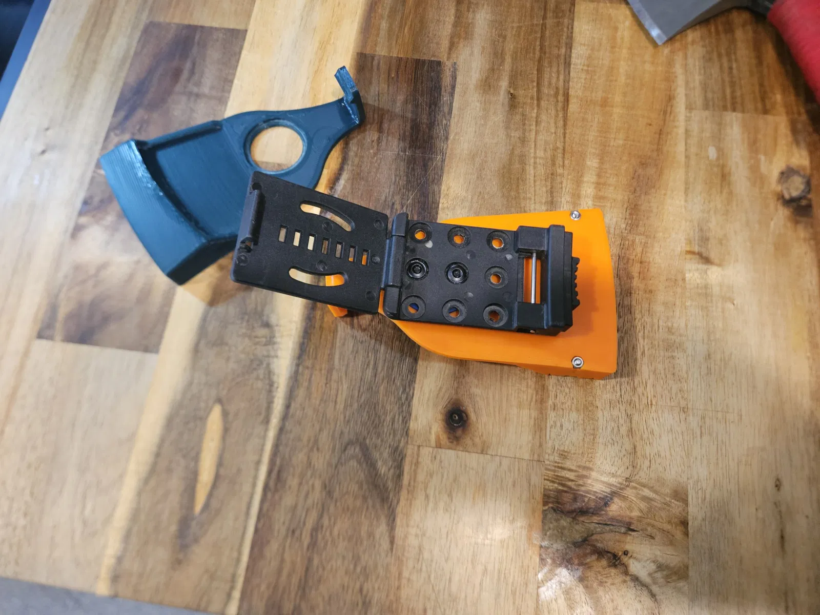 Bao đeo vừa vặn cho rìu Fiskars X7, có thể gắn với kẹp thắt lưng kiểu Tek-Lok. Có hai kiểu gắn (cố định hoặc xoay) và hai kiểu in (1 hoặc 2 mảnh). Chốt khóa cần được định hình bằng nhiệt để vừa khít. Bản V2 có thêm lỗ để giảm trọng lượng và vật liệu.