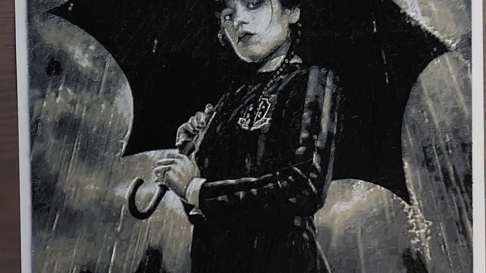 Nhân vật Wednesday Adams cầm ô trong mưa